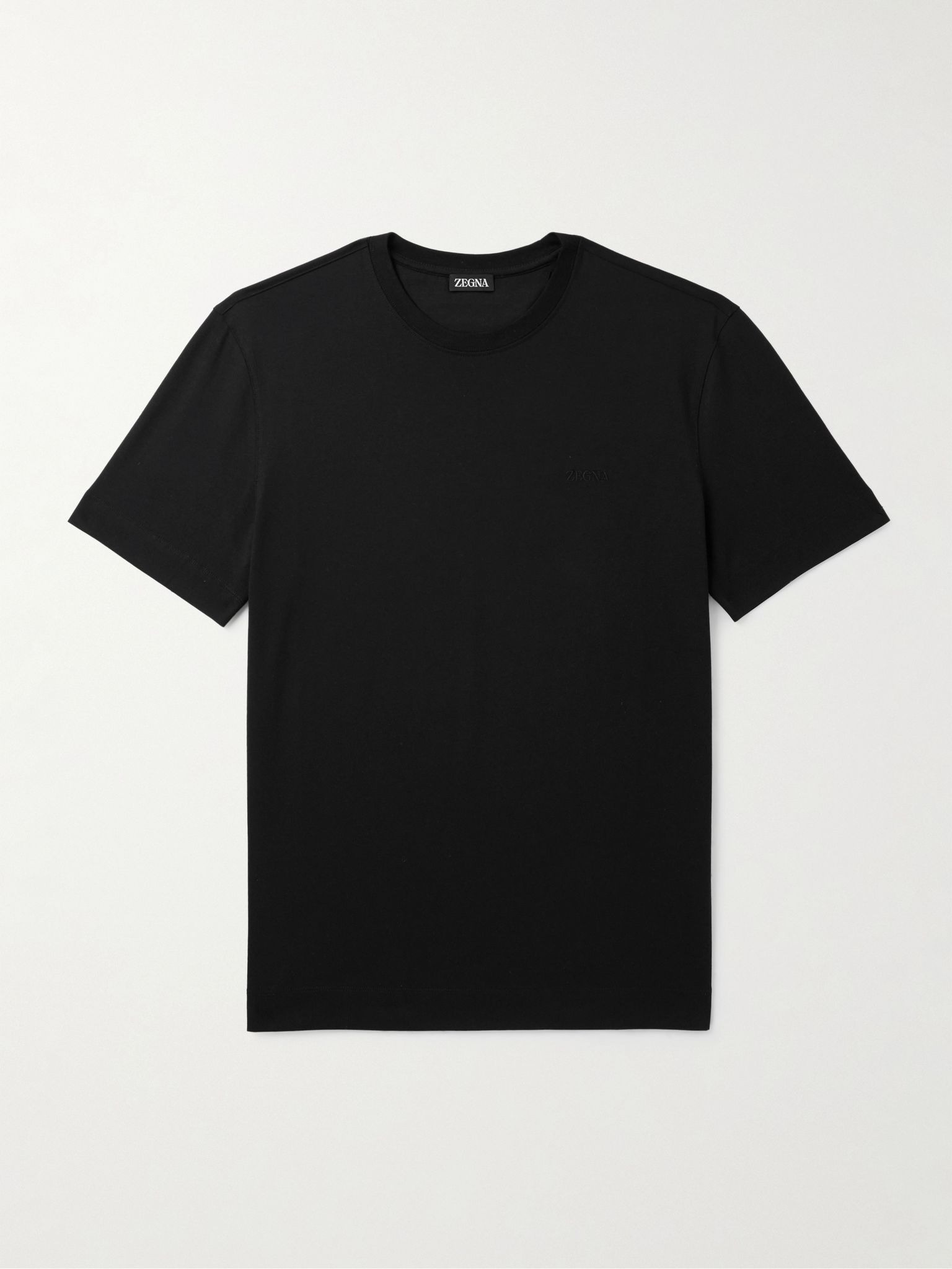 ZEGNA's interpretation of the logo T-shirt is subtle - the tonal embroidery blends right in from afar. It's cut for a slim fit from cotton-jersey with a smooth handle. Size & Fit - Fits true to size. Take your normal size - Designed for a slim fit - Lightweight, stretchy fabric - Model is shown wearing an IT 48 - Italian sizing Details & Care - Black cotton-jersey - 100% cotton - Machine wash
