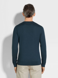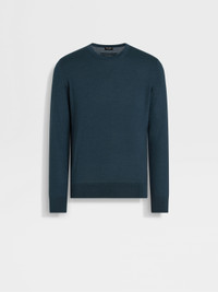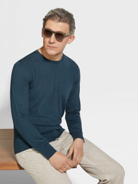 This dark teal blue melange crewneck elevates the everyday staple in Zegna's luxurious Cashseta fabric. INFO The very best of cashmere and silk. This dark teal blue melange crewneck is crafted from Zegna's luxurious Cashseta: an exclusive fabric that's been yarn-dyed to create a distinctive melange finish with subtle variations in each garment. Edged with snug ribbed trims. PRODUCT CODE UFJ00A9-110-T99 MATERIALS AND CARE 70% Cashmere; 30% Mulberry Silk This sophisticated fabric combines the softness of cashmere with the smooth finish of fine silk. The yarns of Cashseta are dyed before the fabric is created, resulting in a melange that is unique to each garment. Wash by hand. Do not bleach. Do not tumble dry. Flat drying. Iron at max 110°C. Professional dry cleaning in hydrocarbons, mild process. Wash and iron inside out. FIT AND PRODUCT DETAILS • 18 gauge • Ribbed collar • Ribbed hem and cuffs