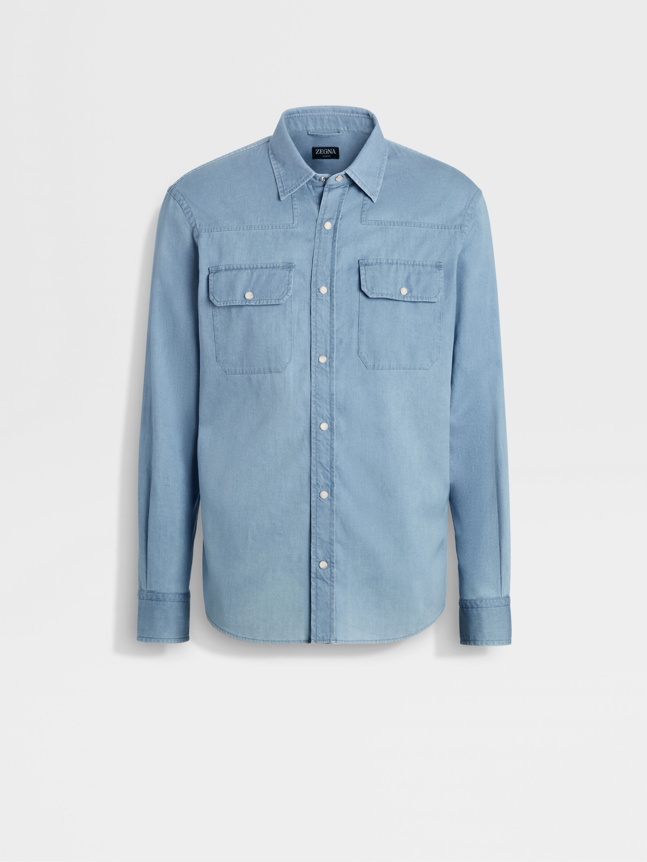 Zegna presents a sophisticated take on an enduring favorite with the light blue Cashco shirt. INFO The light blue Cashco shirt is made from a luxuriously soft and breathable cotton and cashmere denim. The elevated, long-sleeve denim shirt is finished with a bleached wash. It is topped off with a flap pocket on the chest and fastens snap buttons. PRODUCT CODE UEX23A8-STT3-004 MATERIALS AND CARE 95% Cotton; 5% Cashmere This garment is crafted from a luxurious blend of cashmere and cotton for exceptional softness and breathability. Max washing temp 30°C. Do not bleach. Do not tumble dry. Line drying in the shade. Iron at max 110°C. Professional dry cleaning in tetrachloroethene and hydrocarbons. FIT AND PRODUCT DETAILS • Regular fit • Semi-spread collar • Standard cuffs • Snap closure • Rounded hem • Front yoke • Chest flap patch pocket • Bleached • 75 cm length on size 39