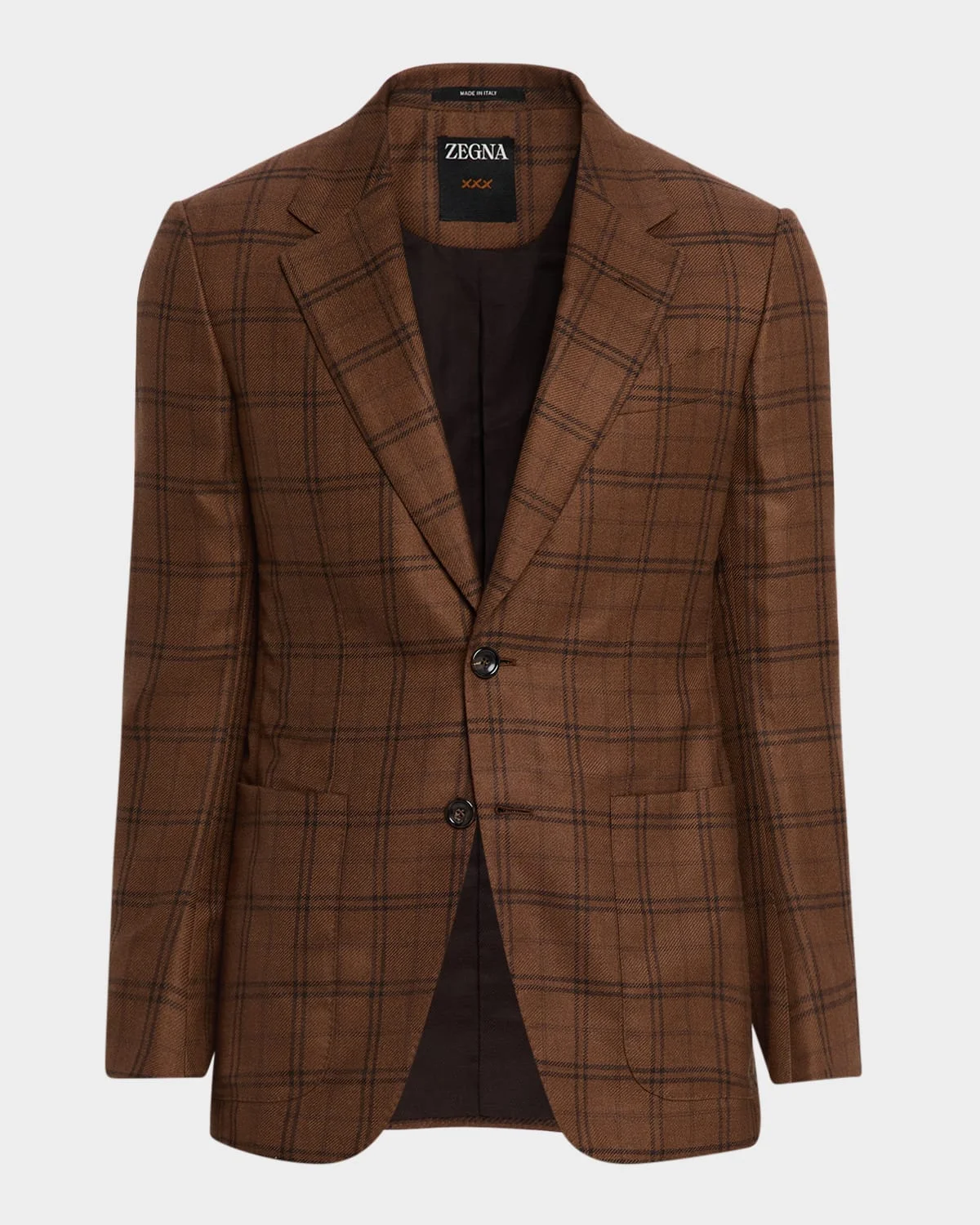 ZEGNA windowpane plaid sport coat in cashmere and silk resulting in a soft and lustrous handfeel Notched lapels Barchetta chest pocket Hip patch pockets Long sleeves Cashmere/silk Fully lined Dry clean Made in Italy