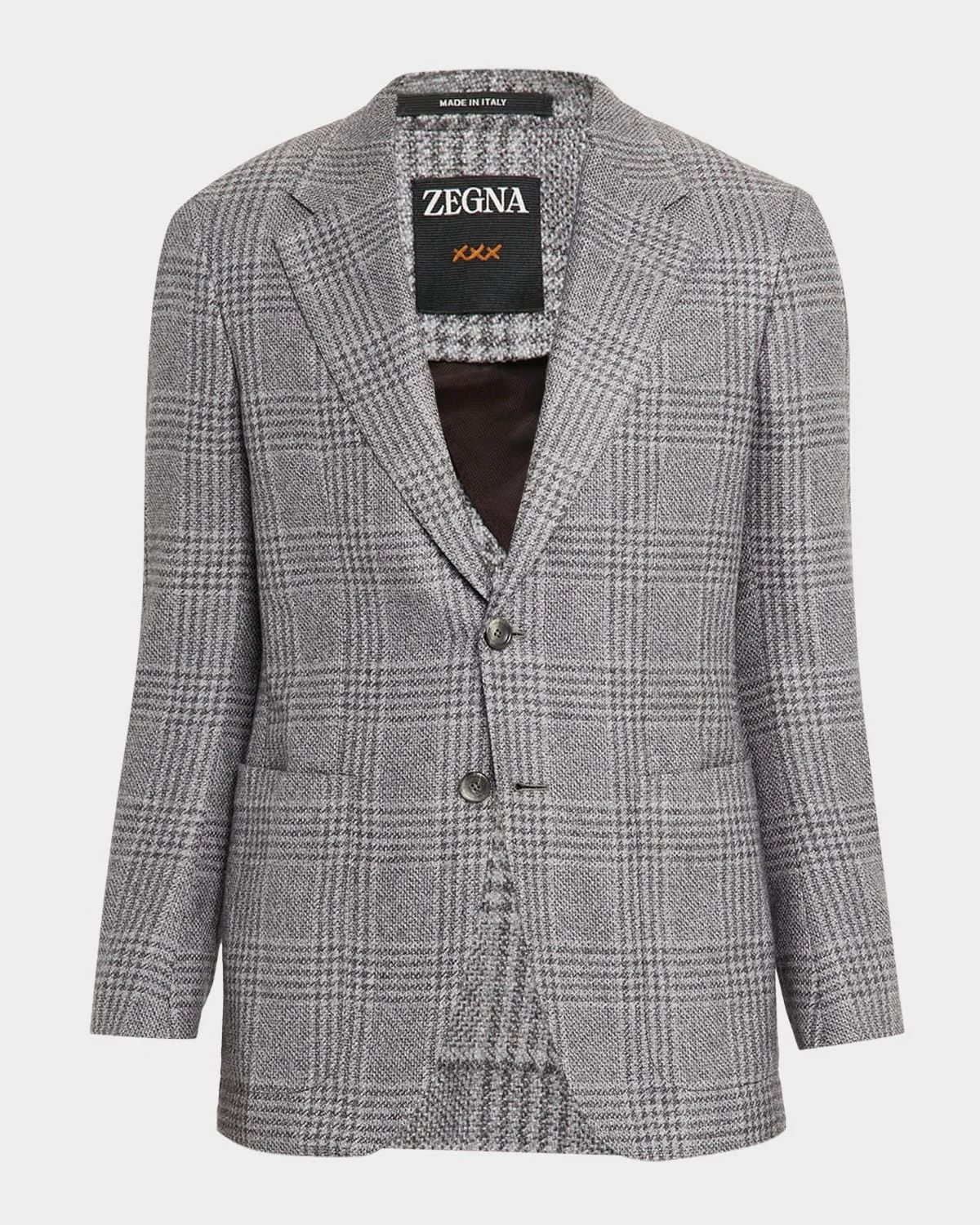 This ZEGNA jacket boasts a macro-checked pattern on a luxurious blend of cashmere and silk finished with timeless sartorial tailoring. Notch lapels Two-button closure Barchetta pocket Hip patch pockets Internal breast pocket Basted sleeves Double-vented back Tailored fit Cashmere/silk Unlined Dry clean Made in Italy