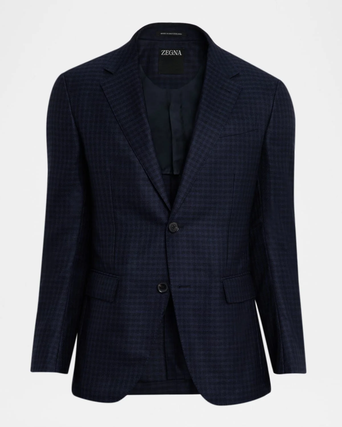 ZEGNA sport coat in lustrous cashmere and silk with a subtle gingham check print Notched lapels Single-breasted front Barchetta chest pocket Hip flap pockets Internal breast pocket Double-vented back Cashmere/silk Unlined Dry clean Made in Italy