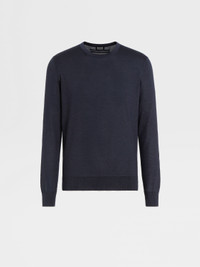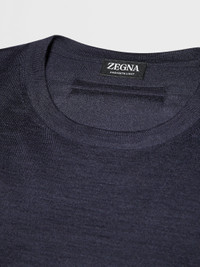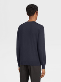 The navy blue mélange Cashseta crewneck brings together cashmere and silk. INFO Zegna's refined blend of cashmere and silk lends the navy blue mélange Cashseta crewneck its distinctive finish. The natural knit feels soft against the skin, elevating a simple design into a luxurious essential. The classic ribbed collar and trims complete the look. Customize this item with our Made to Measure Service. For more information, please contact our Customer Care or visit your nearest stores. PRODUCT CODE E8J00-110-B98 MATERIALS AND CARE 70% Cashmere; 30% Mulberry Silk This sophisticated fabric combines the softness of cashmere with the smooth finish of fine silk. The yarns of Cashseta are dyed before the fabric is created, resulting in a mélange that is unique to each garment. Do not wash. Do not bleach. Do not tumble dry. Iron at max 110°C. Professional dry cleaning in hydrocarbons. FIT AND PRODUCT DETAILS • 18 gauge • Ribbed crewneck collar • Long sleeves • Ribbed hem and cuffs • Regular fit • Model is 188 cm tall (6.2 feet) and wears an Italian size 48.
