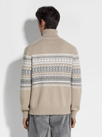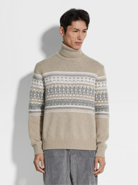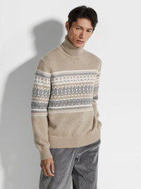 The light taupe Oasi Cashmere turtleneck's luxuriously fine knit is adorned with a multicolored jacquard pattern. INFO Zegna's exclusive, extra-fine cashmere serves as a brilliant canvas for the light taupe Oasi Cashmere turtleneck's jacquard motif. Presented in understated, neutral shades, this elegant design enlivens the classic turtleneck. The sweater is framed by a ribbed collar and matching trim. PRODUCT CODE UEK51A8-ECT120-N02 MATERIALS AND CARE 100% Cashmere The inspiration behind this Oasi Cashmere Collection garment was Born in Oasi Zegna, a 100km² natural territory and the home of our values. It's crafted from Oasi Cashmere fibres, which ZEGNA commits to certifying as traceable from 2024. The Oasi Cashmere Collection follows in the footsteps of our founder, who envisioned a vertically integrated system of producing textiles. Wash by hand. Do not bleach. Do not tumble dry. Flat drying. Iron at max 110°C. Professional dry cleaning in hydrocarbons, mild process. Wash and iron inside out. FIT AND PRODUCT DETAILS • 5 gauge • Ribbed turtleneck collar • Long sleeves • Ribbed trims • Fancy multicolored jacquard pattern • Regular fit