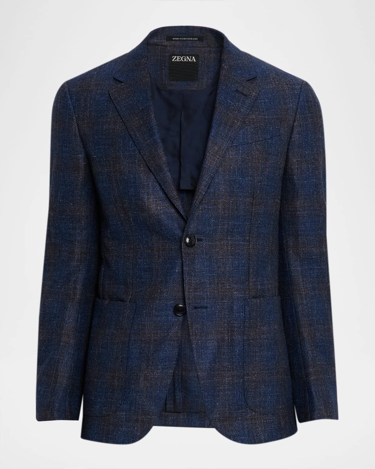 ZEGNA subtle check sport coat in wool, silk and linen resulting in a dimensional textured finish Notched lapels Barchetta chest pocket Hip patch pockets Internal breast pocket Long sleeves Double-vented back Wool/silk/linen Unlined Dry clean Made in Italy