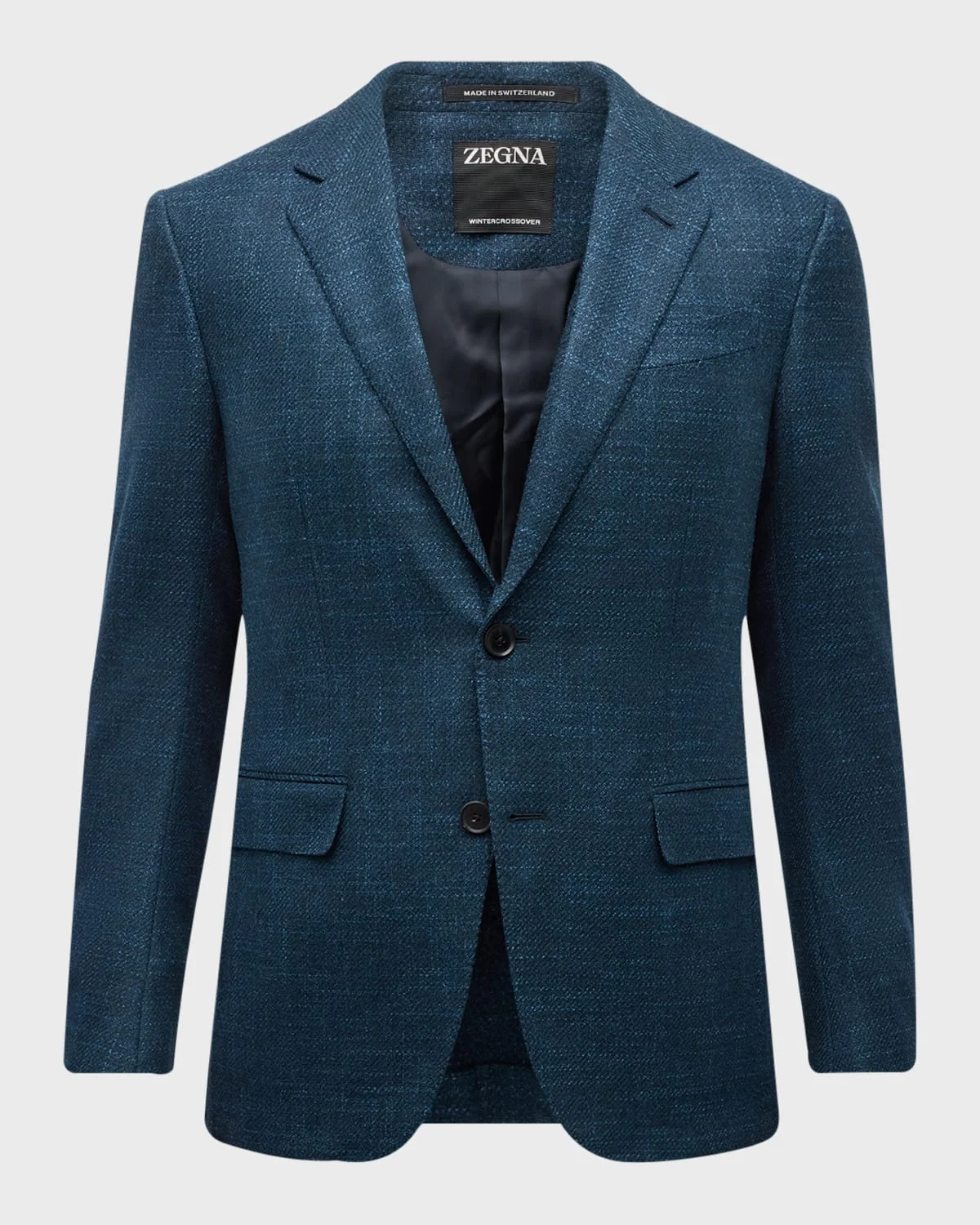 ZEGNA blazer crafted of soft, breathable Crossover summer fabric Notched lapels Two-button closure Chest welt pocket Side flap pockets Shaping darts on front Unfinished sleeves Double-vented back Wool/cashmere Dry clean Made in Italy Model is 6'1"/185cm.