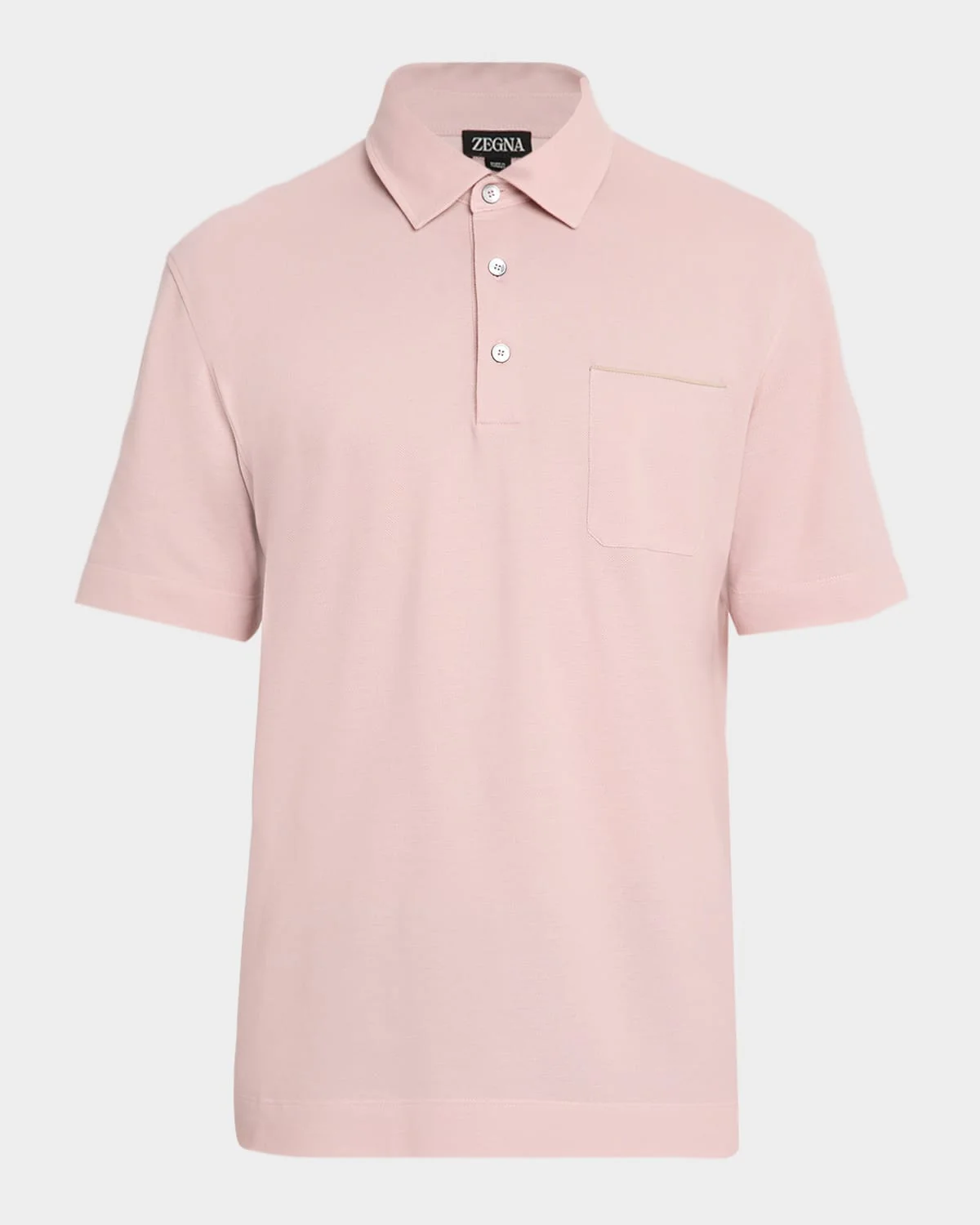 Premium leather accents on the chest pocket add subtle elegance to this pique cotton polo shirt by ZEGNA. Spread collar Threebutton placket Short sleeves Classic fit Pullover style Cotton Unlined Dry clean, machine wash line dry Imported
