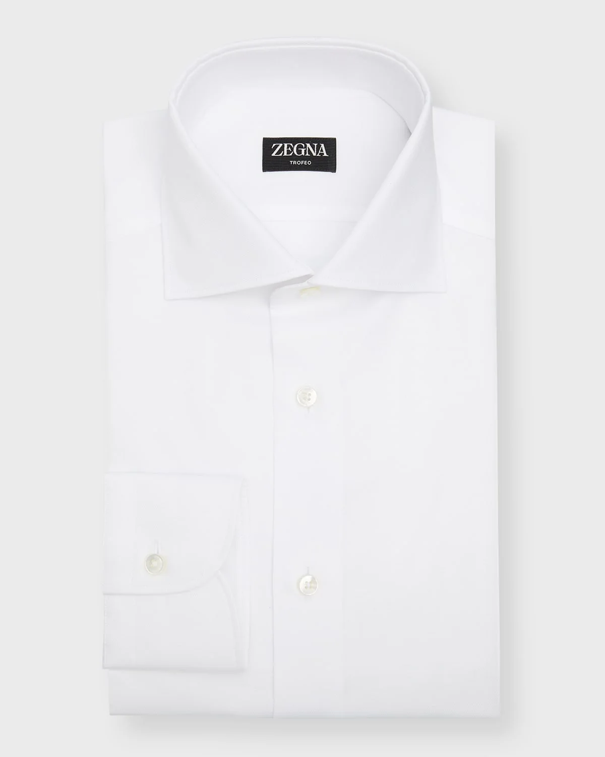 - ZEGNA solid dress shirt crafted from fine, long fibers for a silky smooth finish and added wrinkle-resistance - Spread collar; button placket - Long sleeves - Round barrel cuffs - Yoked back shoulders - Shirttail hem - Cotton - Made in Italy - Model is 6'1"/185cm.