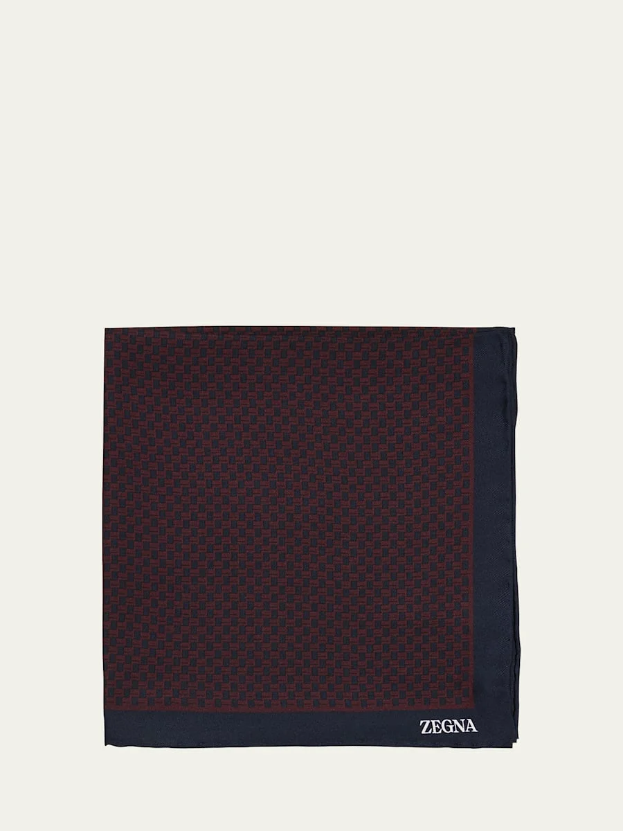 ZEGNA pocket square in silk, showcasing a small rectangular geometric print Contrast border Logo on the corner May be styled multiple ways Silk Do not iron, dry clean Made in Italy