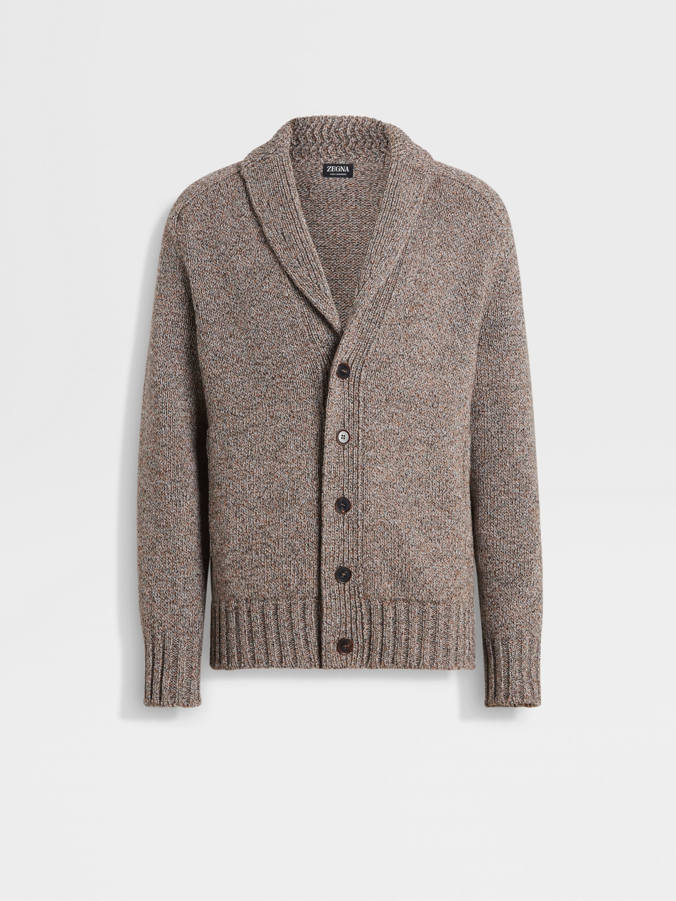 The Dark Foliage and taupe Oasi Cashmere cardigan is knit from one of Zegna's most exclusive natural fibers. INFO A soft, heathered colorway complements the Dark Foliage and taupe Oasi Cashmere cardigan's superfine yarn. This elegant cardigan is styled with a generous shawl collar. Standing side pockets complete the contemporary design. PRODUCT CODE UEK39A8-156-125 MATERIALS AND CARE 100% Cashmere The inspiration behind this Oasi Cashmere Collection garment was Born in Oasi Zegna, our 100km² natural territory and the home of our values. It's crafted from Oasi Cashmere fibres, which ZEGNA commits to certifying as traceable from 2024. The Oasi Cashmere Collection follows in the footsteps of our founder, who envisioned a vertically integrated system of producing textiles. Wash by hand. Do not bleach. Do not tumble dry. Flat drying. Iron at max 110°C. Professional dry cleaning in hydrocarbons, mild process. Wash and iron inside out. FIT AND PRODUCT DETAILS • 3 gauge • Shawl collar • Long sleeves • Ribbed trims • Button closure • Standing side pockets • Mouline yarn