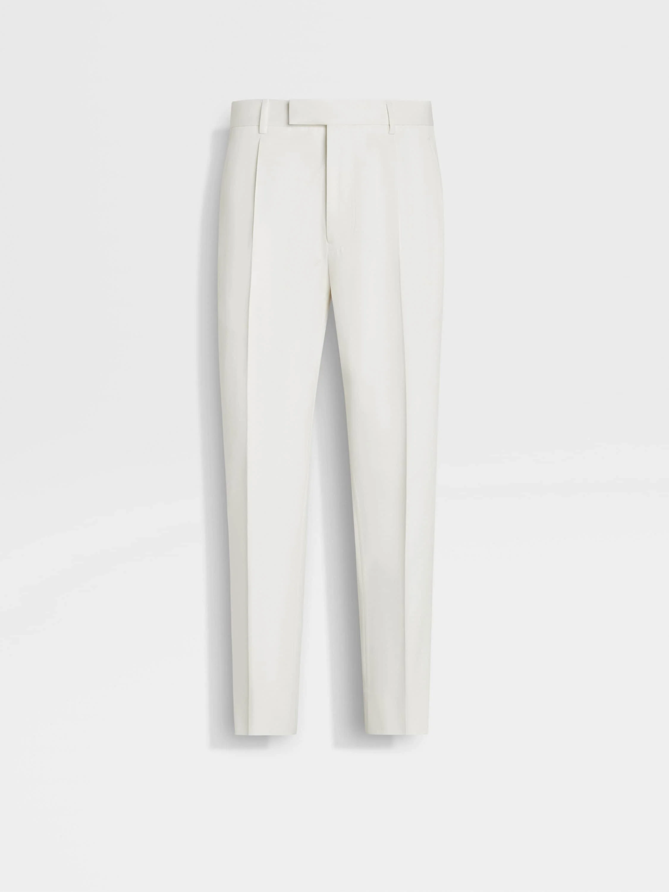Crafted from a white cotton and wool blend, these single-pleat pants exude effortless formal elegance. INFO Cut from a refined cotton and wool blend, these white pants are the ultimate example of quiet luxury. Single front pleats elevate the silhouette with a beautiful drape, bringing classic elegance to formal ensembles. PRODUCT CODE UFI04A9-TP45-N01 MATERIALS AND CARE Main body: 57% Cotton; 43% Wool Lining: 100% Cotton Do not wash. Do not bleach. Do not tumble dry. Iron at max 110°C. Professional dry cleaning in hydrocarbons, mild process. FIT AND PRODUCT DETAILS • Pleated fit • 19.5 cm open hem • Zip and button closure • Slanted pockets and back welt pocket • One pleat style