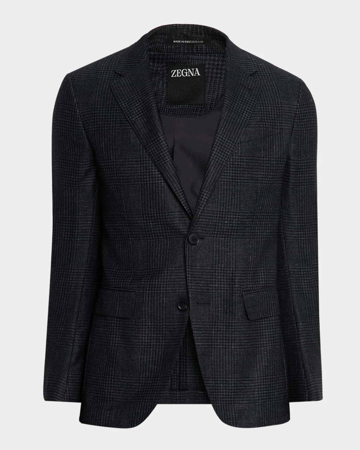 ZEGNA Prince of Wales sport coat in a soft and lustrous cashmere blend Notched lapels Single-breasted front Barchetta chest pocket Hip flap pockets Long sleeves Double-vented back Cashmere/silk/linen Unlined Dry clean Made in Italy