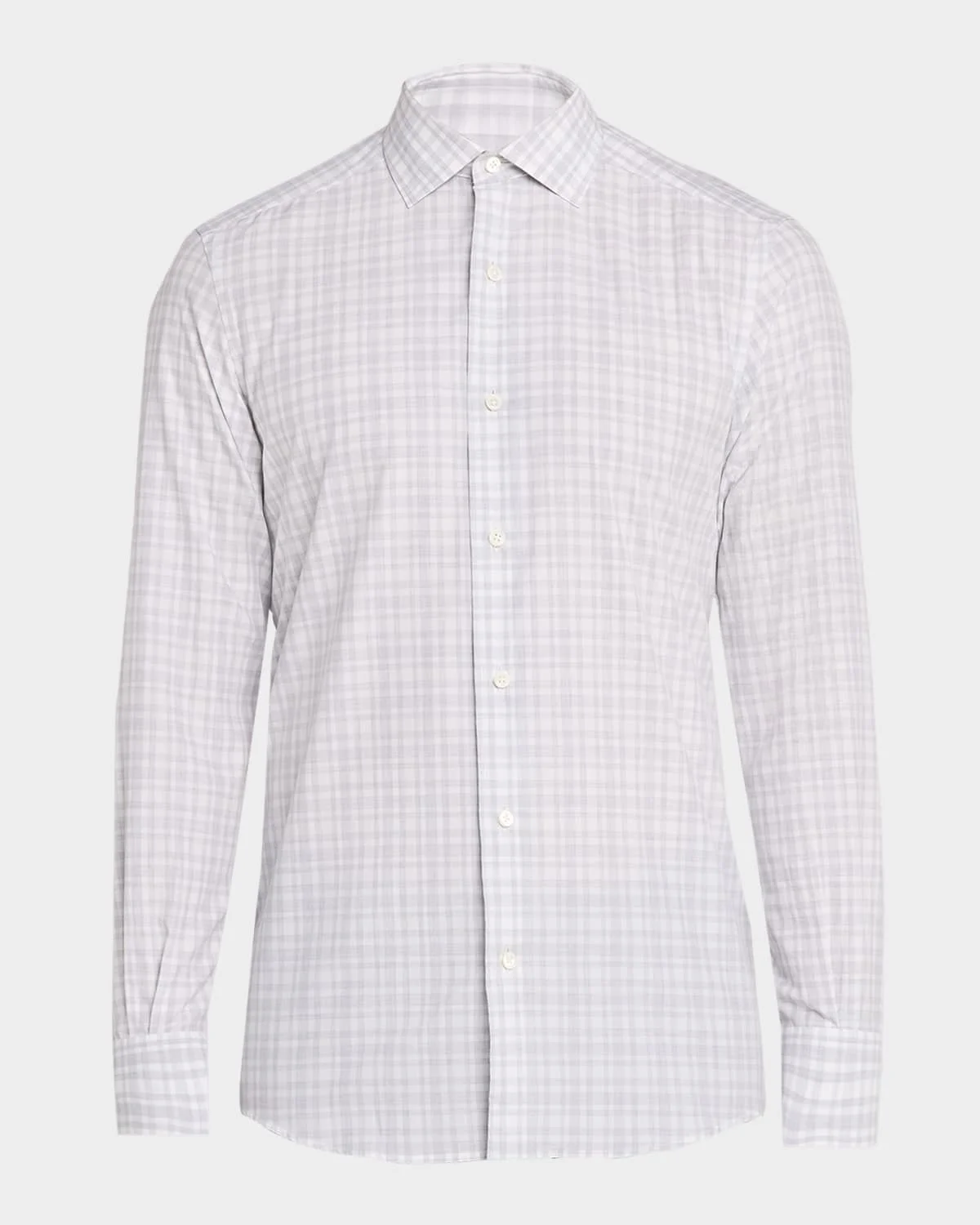 A subtle plaid print adds an understated allure to this breathable cotton twill sport shirt from ZEGNA. Genuine mother-of-pearl buttons Point collar Button placket Back yoke; knife pleats Long sleeves Round barrel cuffs Curved hem Classic fit Cotton Dry clean Imported