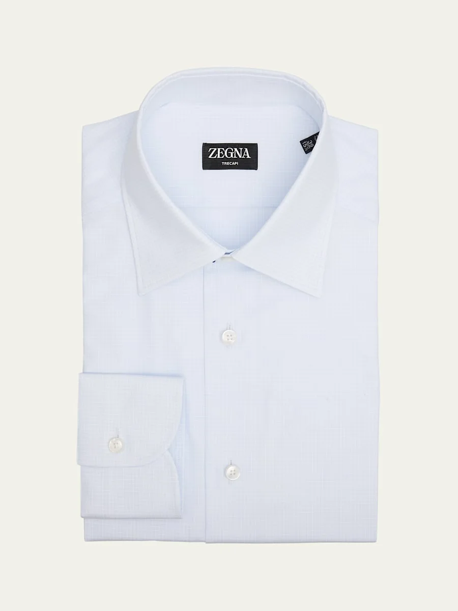 ZEGNA formal shirt in premium Trecapi cotton displaying a micro-grid check print Trecapi is made from ultra-fine, triple-twisted cotton fibers for added durability and resilience Point collar Button placket Long sleeves Round barrel cuffs Back yoke Shirttail hem Cotton Dry clean Imported Online Inquiries: BGS21_NDNT2| Store Inquiries: #5056046