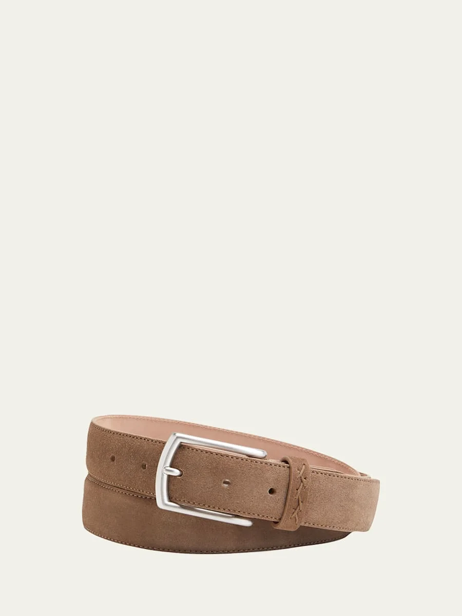 ZEGNA belt with triple stitch leather loop Approx. 1.3"W Silvertone singleprong buckle Adjustable fit Calf leather Made in Italy
