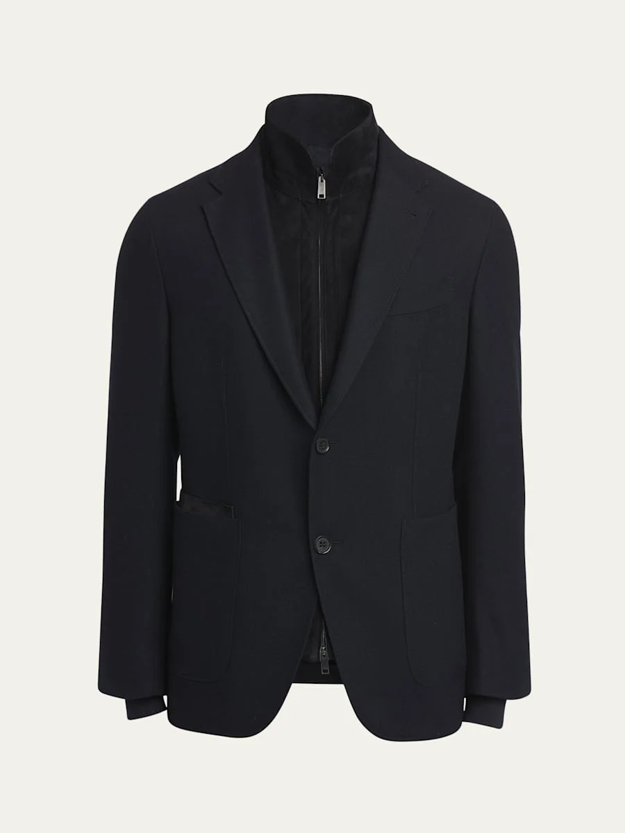 ZEGNA blazer in Trofeo™ wool and cashmere featuring a removable suede bib front Notched lapels Singlebreasted front Barchetta chest pocket Hip patch pockets Long sleeves Buttoned cuffs Doublevented back Wool/cashmere Lining: Cupro/wool Made in Italy