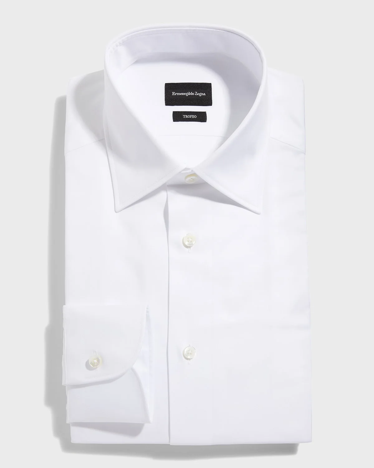 - ZEGNA Trofeo® solid woven dress shirt - Approx. length: - 28" from shoulder to hem - Spread collar; French-placket button front - Rounded barrel cuffs - Regular fit - Shirttail hem - Cotton - Machine wash - Imported - Model is 6'1"/185cm.