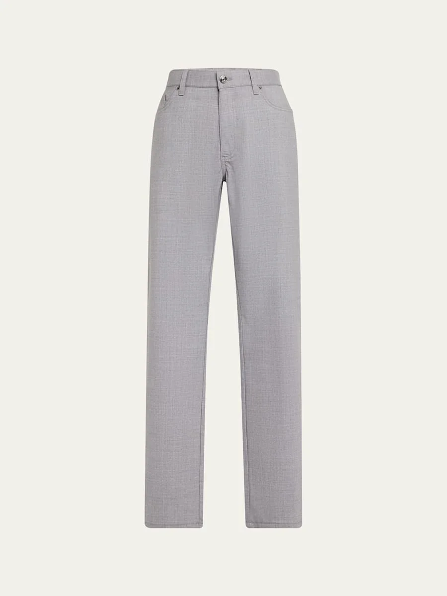 ZEGNA pants in wool with a leather logo patch on the back Regular rise Five-pocket style Fitted through slim legs Full length Button-zip front; belt loops Wool/leather Lining: Cotton/elastane/polyester Dry clean Made in Italy Online Inquiries: BGS21_NCN05| Store Inquiries: #4921056