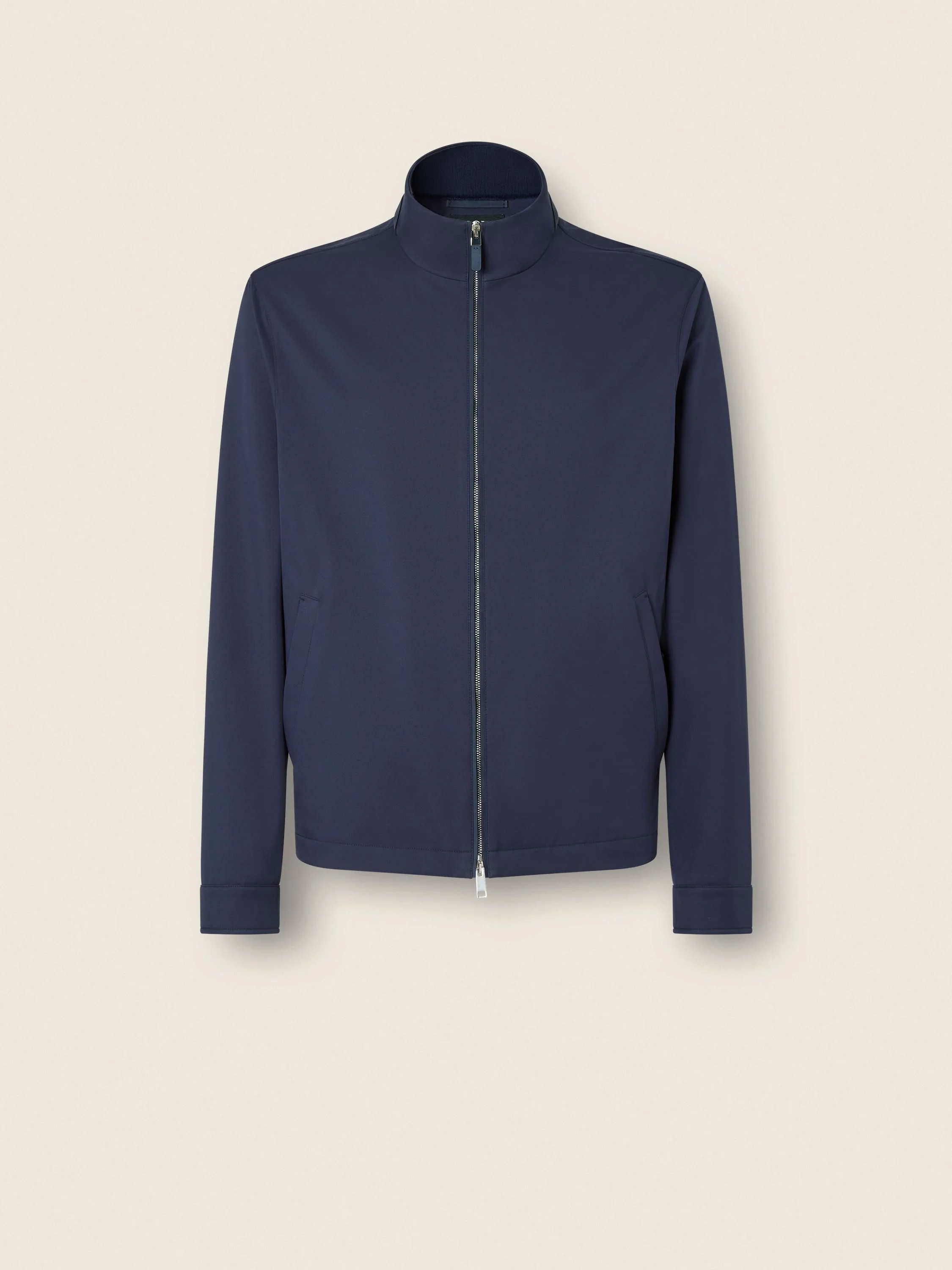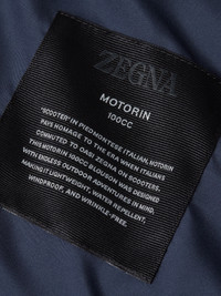 Choose contemporary elegance in this dark indigo blue microfiber Motorin 100cc Blouson. INFO Featuring a stand collar, shirt cuffs and a half-elasticated hem, this Motorin 100cc blouson is crafted from dark indigo blue microfiber for a seamless blend of elegance and practicality. Leather details add a refined touch. In Piedmontese Italian, the Founder referred to the scooters as 'motorin'. This piece pays homage to the era when Italians commuted to Oasi Zegna on scooters. The Motorin 100cc blouson was designed with endless outdoor adventures in mind, making it lightweight, water-repellent, windproof, and wrinkle-free. PRODUCT CODE UHTD5A3-HCT575-B07 MATERIALS AND CARE Main body: 100% Polyester Lining: 100% Polyester Do not wash. Do not bleach. Do not tumble dry. Iron at max 110°C. Professional dry cleaning in hydrocarbons, mild process. Professional leather clean only. Protect leather details before washing. Protect the metal accessories during washing. FIT AND PRODUCT DETAILS • Regular fit • Stand collar • Inner ribbed collar • Zip closure • Half-elasticated hem • Shirt cuffs • Leather details • Slanted jet pockets with concealed snap buttons • Water resistant • 67 cm length on size 48