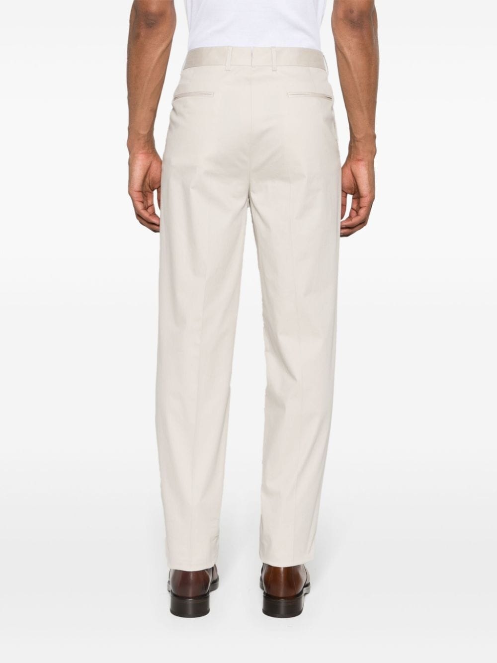 mid-rise poplin chino trousers Highlights - Zebra white - Cotton - Poplin texture - Pleat detailing - Slim cut - Mid-rise - Concealed fly and button fastening - Belt loops - Two diagonal pockets to the sides - Two rear welt pockets - Pressed crease Imported Composition Outer: Cotton 96%, Elastane 4% Lining: Cotton 100% SIZE & FIT Model measurements Height 6 ft 2 in(1.87 m) Bust/Chest 37 in(94 cm) Hips 33.85 in(86 cm) Waist 27.95 in(71 cm) FittingInformation Designed for a tapered leg, offering a loose unrestricted fit over the leg with a closer fit towards the ankle Made from a midweight stretch fabric, this piece offers elasticity and flexibility when worn This piece fits true to size – take your usual size