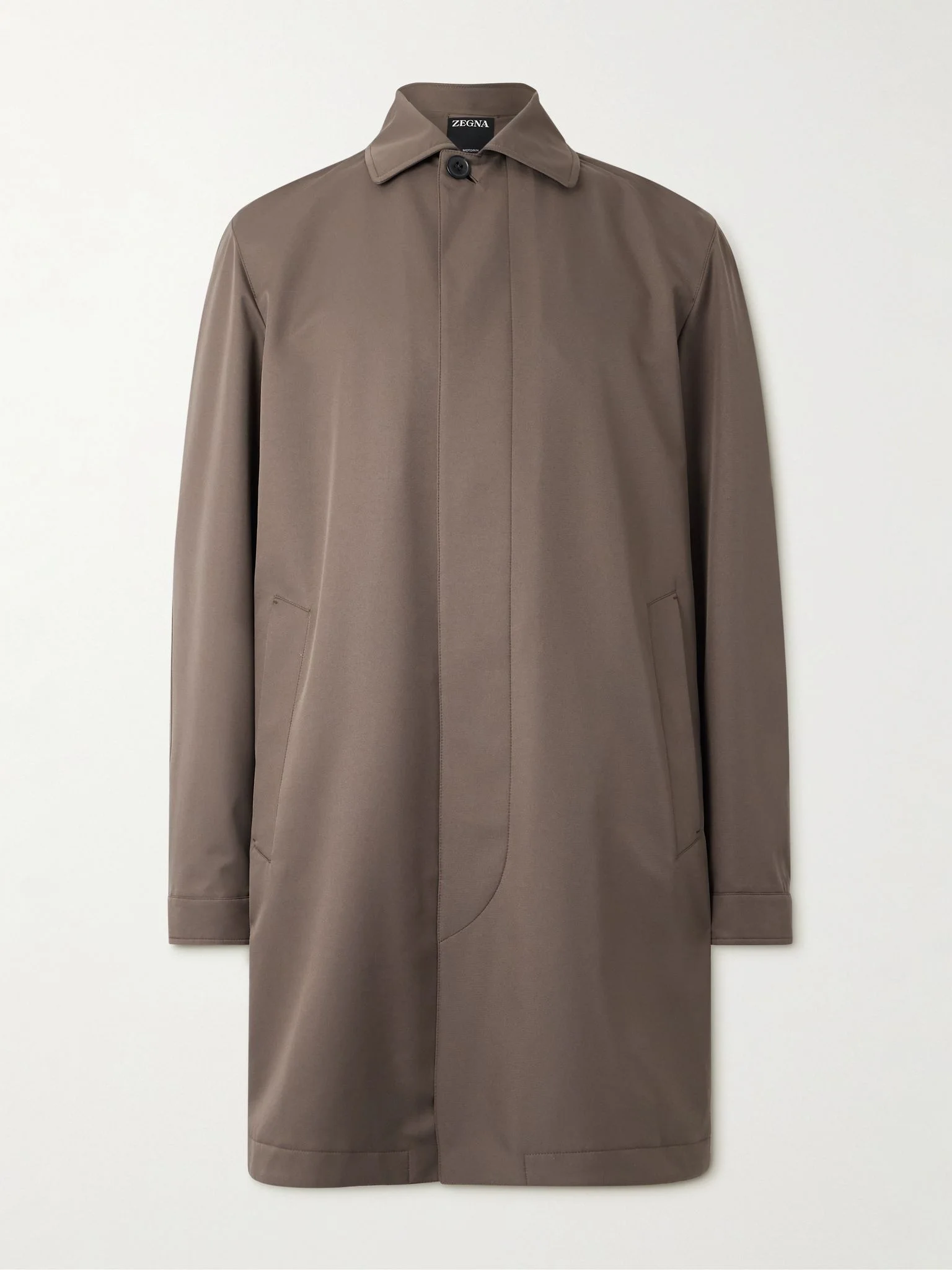 ZEGNA's streamlined 'Motorin 300cc' pays homage to the days when Italians drove their scooters to Oasi Zegna. It's made from lightweight satin-twill that's water- and wind-repellent. Size & Fit - Model wears a size larger to achieve a looser fit - Mid-weight, non-stretchy fabric - Model is shown wearing an IT 50 - Model measures: chest 38"/ 96cm, height 6'2"/ 188cm Details & Care - Brown satin-twill - Button fastenings - 100% polyester; trim: 100% leather (Calf); buttons: 100% horn (Buffalo); back lining: 100% wool - Dry clean