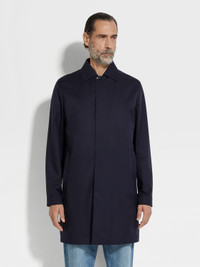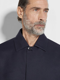 Choose functional elegance in this navy blue Motorin 300cc microfiber rain coat. INFO Crafted from navy blue microfiber, the Motorin 300cc rain coat is a refined wet-weather essential. Styled with an elegant shirt collar and sophisticated leather details in line with Zegna's vision of luxury leisurewear. ''Scooter' in Piedmontese Italian, Motorin pays homage to the era when Italians commuted to Oasi Zegna on scooters. This Motorin 300cc raincoat was designed with endless outdoor adventures in mind, making it lightweight, water repellent, and windproof. PRODUCT CODE UFTC5A9-FCT578-B09 MATERIALS AND CARE Main body: 100% Polyester Leather details: Calfskin Do not wash. Do not bleach. Do not tumble dry. Iron at max 110°C. Professional dry cleaning in hydrocarbons, mild process. Professional leather clean only. Protect leather details before washing. Protect metal accessories during washing. FIT AND PRODUCT DETAILS • Regular fit • Spread shirt collar • Button closure with concealed placket • Straight hem • Adjustable cuffs • Leather details • Slanted jet pockets • Water repellent • 95 cm length on size 48