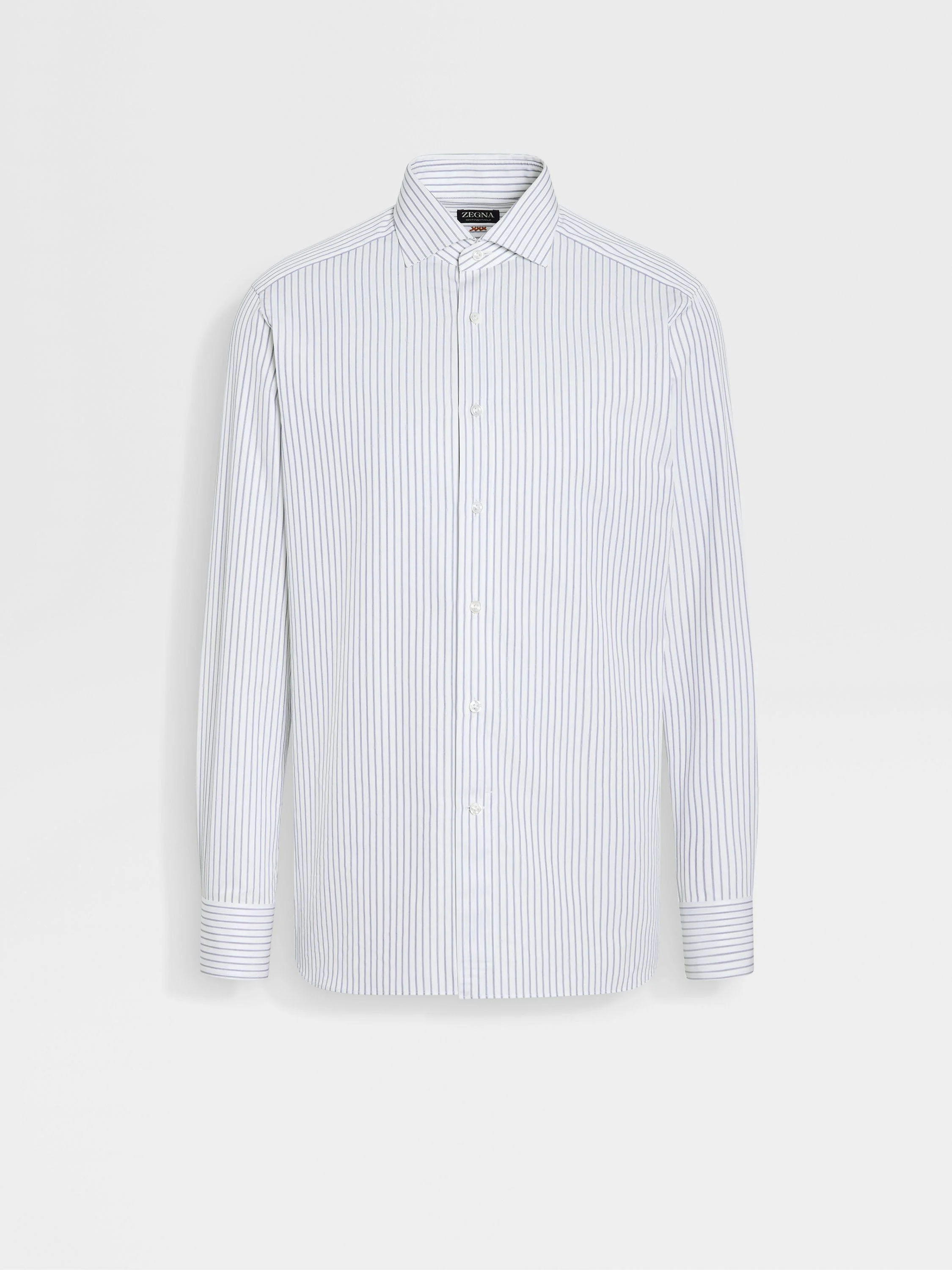 A white and navy blue structured striped pattern and soft Centoventimila cotton: this long-sleeve shirt is a formal essential. INFO Featuring long sleeves and a spread collar, this shirt is crafted from exquisite Centoventimila cotton for an impeccably smooth feel against the skin. Styled with a structured white and navy blue striped pattern. PRODUCT CODE 202020A2-9NS0LB MATERIALS AND CARE 100% Cotton Centoventimila – Italian for 120,000 – is named after its high thread count. Garments crafted from this fabric are extremely lightweight and have a soft, silk-inspired hand feel. Max washing temp 40°C. Do not bleach. Do not tumble dry. Iron at max 150°C. Professional dry cleaning in tetrachloroethene and hydrocarbons. FIT AND PRODUCT DETAILS • Regular fit • Tailoring shirt • Spread collar • Standard cuffs • Button closure • Structured striped pattern • 79 cm length on size 39