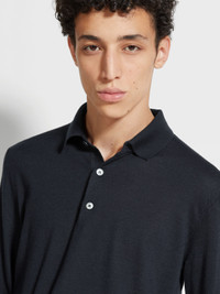 The navy blue Cashseta polo shirt is made from a soft blend of natural fibers. INFO An elevated addition to any casual wardrobe, Zegna's refined blend of cashmere and silk lends the navy blue Cashseta polo shirt its distinctive finish. The long-sleeved polo is finished off with the classic ribbed collar and cuffs. Customize this item with our Made to Measure Service. For more information, please contact our Customer Care or visit your nearest stores. PRODUCT CODE E8J00-132-B98 MATERIALS AND CARE 70% Cashmere; 30% Mulberry Silk This sophisticated fabric combines the softness of cashmere with the smooth finish of fine silk. The yarns of Cashseta are dyed before the fabric is created, resulting in a mélange that is unique to each garment. Do not wash. Do not bleach. Do not tumble dry. Iron at max 110°C. Professional dry cleaning in hydrocarbons. Wash inside out. FIT AND PRODUCT DETAILS • 18 gauge • Ribbed polo collar • Long sleeves • Ribbed hem and cuffs • Button closure • Regular fit • Model is 185 cm tall (6.0 feet) and wears an Italian size 48.