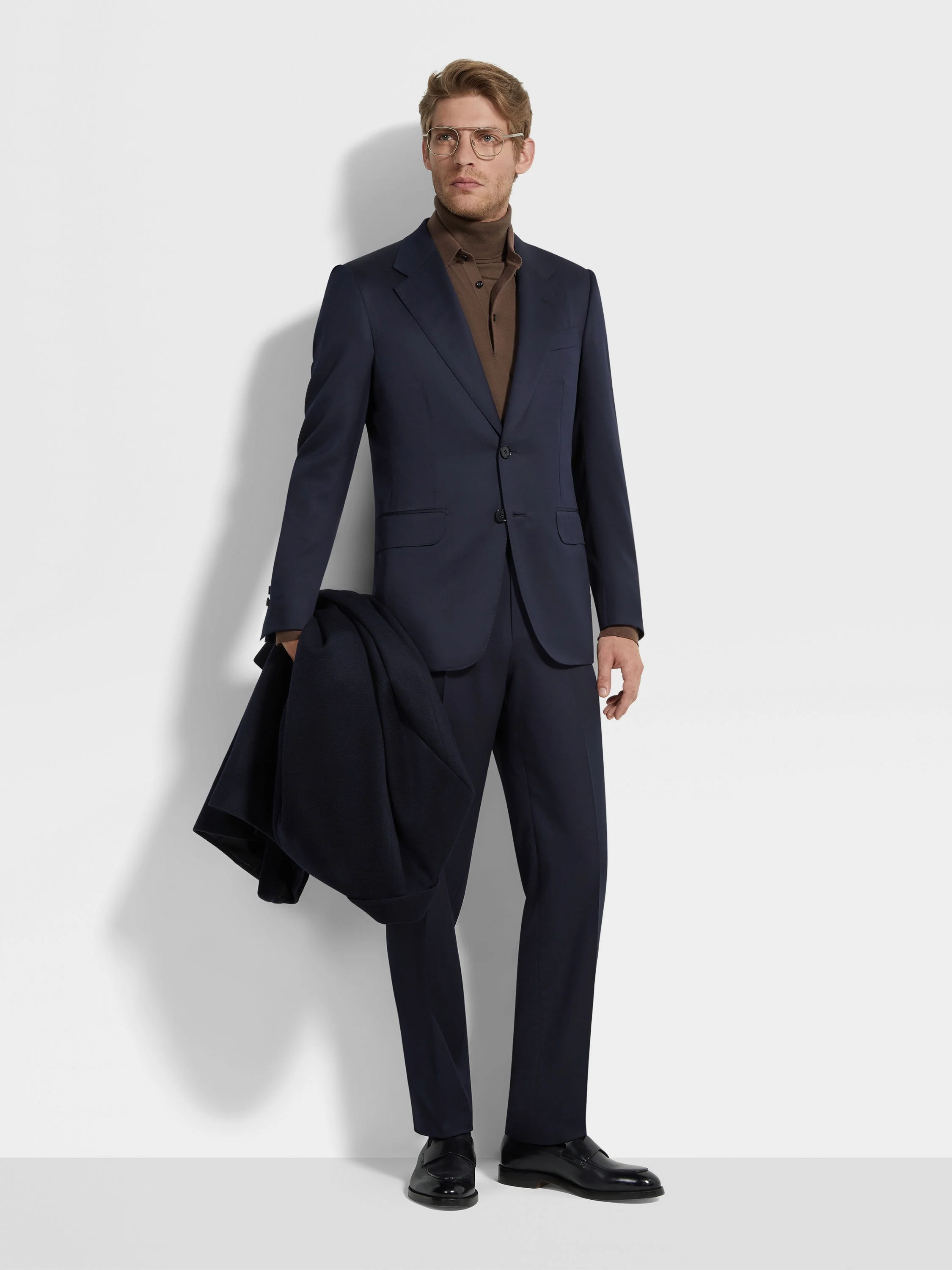 This navy blue suit showcases the beauty of ZEGNA's exquisite Centoventimila wool. INFO Comprising a double-vented jacket with notch lapels and flat-fronted pants, this navy blue suit brings effortless elegance to formal occasions. Crafted from refined Centoventimila wool for a silk-like feel with featherlight comfort. PRODUCT CODE 222532A2-21L2N5 MATERIALS AND CARE 100% Wool Centoventimila – Italian for 120,000 – is named after its high thread count. Garments crafted from this fabric are extremely lightweight and have a soft, silk-inspired hand feel. Do not wash. Do not bleach. Do not tumble dry. Iron at max 110°C. Professional dry cleaning in tetrachloroethene and hydrocarbons, mild process. FIT AND PRODUCT DETAILS • Regular fit • Drop 7 • Tailoring suit • Double vents • Notch lapels • Flap pockets • Canvas construction • Lined • 75 cm length on size 48 • Flat front pants, 20 cm hem Sleeves and pants are unfinished. You can bring your jacket and pants to our boutiques for alterations.