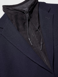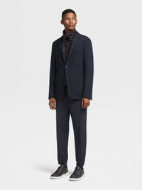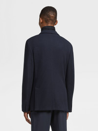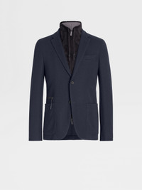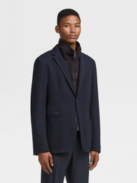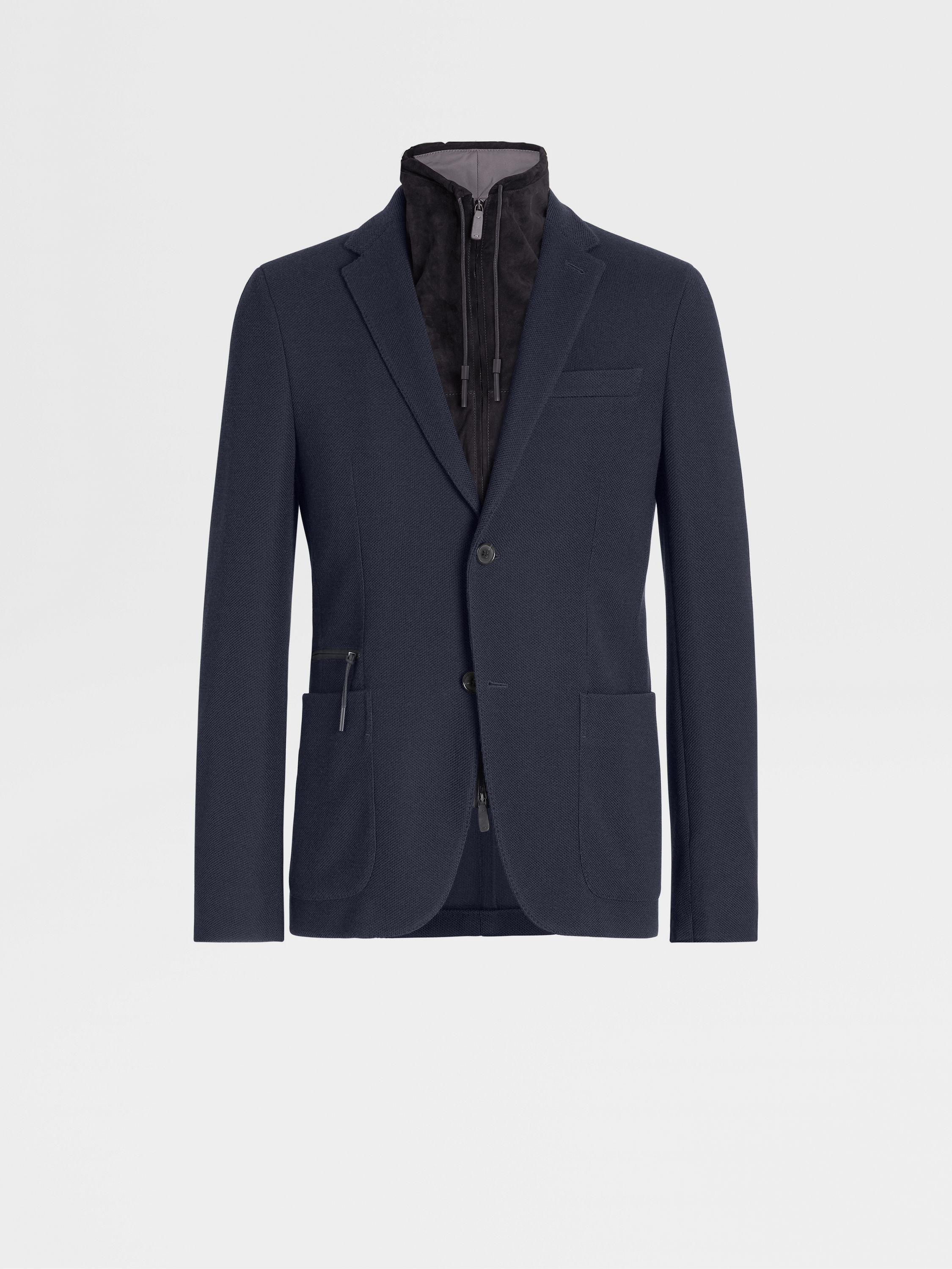 The navy blue High Performance™ Jersey jacket blends wool and cotton. INFO Zegna's technologically enhanced, all-season wool makes the navy blue High Performance™ Jersey jacket exceptionally soft and breathable. The perfect match for a versatile jacket, this material is enhanced with a subtle honeycomb texture. A detachable leather bib and zip pockets put a new twist on a classic design. PRODUCT CODE UBC60A5-DLR-100 MATERIALS AND CARE Main body: 63% Wool; 37% Cotton Leather details: Calfskin Lining: 100% Polyester This garment is crafted from High Performance™ Jersey, which incorporates extrafine merino — a fibre prized for its naturally soft, breathable and moisture-wicking properties. The structure of the fabric imbues it with elasticity, making it ideal for life on the move. Mild dry clean with hydrocarbon solvents. Do not bleach. Do not tumble dry. Regular ironing, steam or dry, may be performed at low setting (110°C / 230°F). FIT AND PRODUCT DETAILS • Regular fit • Notch lapels • Leather detachable bib • Breathable fabric with honeycomb texture • Button closure • Patch and zip pockets • Deconstructed and fused • Half-lined • 73.5 cm length on size 48