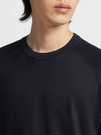 Enjoy the benefits of Zegna's advanced materials with the navy blue High Performance™ wool T-shirt. INFO The navy blue High Performance™ wool T-shirt's ultra soft material is exceptionally breathable, ensuring the highest level of comfort and resilience. Styled with folded cuffs, this elevated essential defines refined leisurewear. A classic knit crewneck completes the look. PRODUCT CODE E7328A5-BCT706-B09 MATERIALS AND CARE 100% Wool High Performance™ fabric incorporates extrafine merino that's breathable, lightweight and wrinkle resistant, making it ideal for life on the move. Suitable for wear throughout all seasons, it naturally wicks moisture for exceptional comfort. Wash by hand. Do not bleach. Do not tumble dry. Line drying in the shade. Iron at max 110°C. Professional dry cleaning in hydrocarbons. FIT AND PRODUCT DETAILS • Short sleeves • Knit crewneck collar • Folded hem and cuffs • Easy-to-fold sleeves' hems • Regular fit