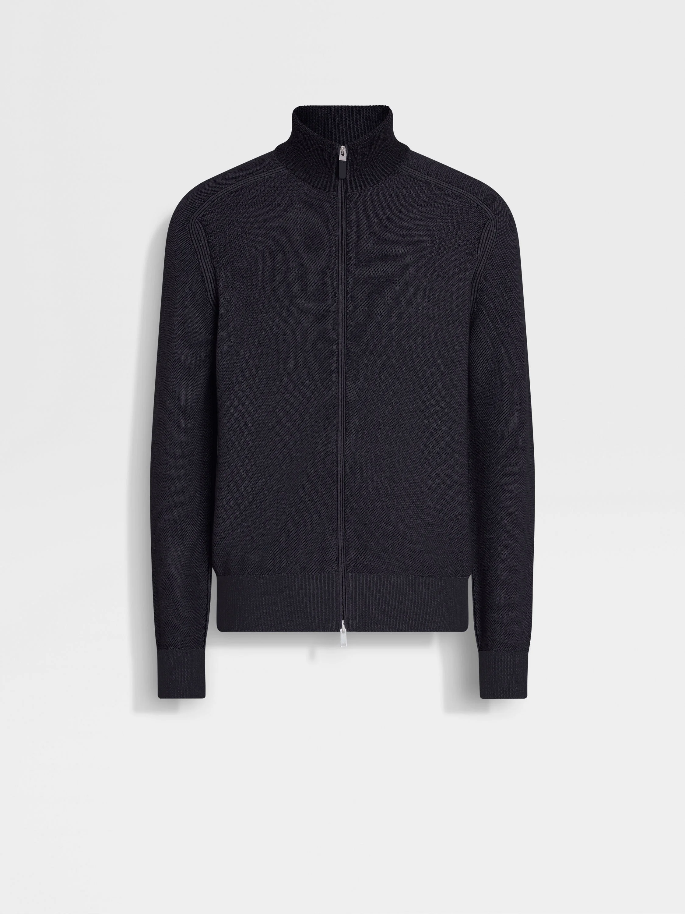 This navy blue melange full-zip cardigan elevates a leisurewear staple in ZEGNA's luxurious Cashseta fabric. INFO The very best of cashmere and silk. This zip-through cardigan is knit with a navy blue melange jacquard design from ZEGNA's luxurious Cashseta: an exclusive fabric that's been yarn-dyed to create a distinctive melange finish with subtle variations in each garment. Edged with snug ribbed trims. PRODUCT CODE UGJ92A2-157-B98 MATERIALS AND CARE 70% Cashmere; 30% Mulberry Silk This sophisticated fabric combines the softness of cashmere with the smooth finish of fine silk. The yarns of Cashseta are dyed before the fabric is created, resulting in a melange that is unique to each garment. Do not wash. Do not bleach. Do not tumble dry. Iron at max 110°C. Professional dry cleaning in hydrocarbons, mild process. FIT AND PRODUCT DETAILS • Regular fit • 18 gauge • Ribbed stand collar • Long sleeves • Ribbed hem and cuffs • Zip closure • Jacquard knit