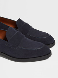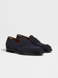 The navy blue suede Torino loafers offer timeless elegance and modern style. INFO Combining elegance with contemporary flair, the navy blue suede Torino loafers are effortlessly sophisticated. The slip-on design is crafted from calf leather and features the classic band across the uppers. The toe and heel are reinforced with rubber injections for stability. PRODUCT CODE LHCRD-A5960Z-BLU MATERIALS AND CARE Suede Clean with a soft cloth. Maintain the leather's glossy appearance by applying a small dab of polish and distributing it uniformly over the surface with a soft cloth. Let dry for a few minutes, then vigorously shine with clean, soft cloth. Avoid contact with abrasives, including hard-bristled brushes, and substances containing alcohol, such as perfumes, solvents, etc. In case of contact with water, it is important to let the footwear dry completely before cleaning. Store in the included dust bag in a cool, dry place. FIT AND PRODUCT DETAILS • Suede • Foliage-colored lining • Band on the upper • Blake construction • Stitched leather sole • Rubber inserts at toe and heel • Made in Italy • Fits true to size • Comes with a shoe bag
