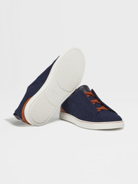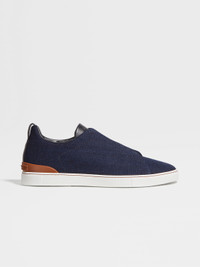 The blue cotton denim Triple Stitch™ low top sneakers put a lightweight twist on Zegna's iconic slip-on shoe. INFO With their breathable uppers, the blue cotton denim Triple Stitch™ low top sneakers are perfect for casual days. Lightweight and flexible, this playful design is accentuated with Foliage-colored details. The sneakers are fitted with a white rubber sole and slip on easily thanks to the collection's iconic, triple-crossed elastics, which evoke the hand-stitching on our tailored jackets. PRODUCT CODE LHCID-S5551Z-BCV MATERIALS AND CARE Cotton; Calfskin Clean with a soft cloth. Avoid contact with abrasives, water and substances containing alcohol, such as perfumes, solvents, etc. In case of contact with water, it is important to let the footwear dry completely before cleaning. Clean the rubber soles with a product specifically designed for cleaning rubber. Store in the included dust bag in a cool, dry place. FIT AND PRODUCT DETAILS • Crossed elastic laces • Strobel construction • Zegna 232 Road Brand Mark on the heel tab • Foliage-colored details • Microfiber lining • Sanitized® insole • White rubber sole • Made in Italy • Comes with a shoe bag We want every pair of Triple Stitch™ sneakers to fit perfectly anytime, anywhere, anyplace. To find your perfect fit, we recommend going down a half-size compared to your usual shoe size. Please note that Zegna uses UK sizing. For further information, please contact us via our customer service channels or by visiting the nearest Zegna flagship store.