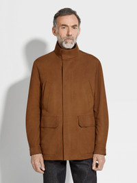 The Dark Foliage nubuck car coat's luxurious material is paired with Zegna's signature colorway. INFO Made from pure calfskin, the Dark Foliage nubuck car coat puts a contemporary twist on a classic menswear icon. The outerwear is lined with a soft, wool blend and padded for extra warmth. It is equipped with a foldable hood, a stand collar, and plenty of pockets. PRODUCT CODE UEPNWA8-E275-N05 MATERIALS AND CARE Main body: Calfskin Nubuck Leather details: Calfskin Lining: 89% Wool; 6% Mulberry Silk; 5% Cashmere Padding: 100% Polyester Do not wash. Do not bleach. Do not tumble dry. Iron at max 110°C. Professional dry cleaning in hydrocarbons, mild process. Professional leather clean only. FIT AND PRODUCT DETAILS • Regular fit • Stand collar with stowaway hood • Concealed snap button closure • Straight hem • Adjustable cuffs • Leather details • Flap patch pockets and slanted chest pockets • Polyester padding • Wool blend lining • 76 cm length on size 48