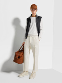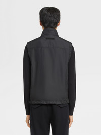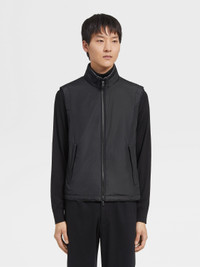 The nylon reversible vest is designed for both performance and versatile style. INFO Choose between the black and grey nylon reversible vest's two sides to suit different moods: resilient microfiber or a soft, cashmere blend jersey. The stand collar and adjustable hem block out the wind, while keeping the look sleek and streamlined. The vest fastens with a zipper and leather drawstrings. Customize this item with our Made to Measure Service. For more information, please contact our Customer Care or visit your nearest stores. PRODUCT CODE E7T33-7110B-001 MATERIALS AND CARE Main body: 100% Polyester Leather details: Calfskin Do not wash. Do not bleach. Do not tumble dry. Iron at max 110°C. Professional dry cleaning in hydrocarbons, mild process. Professional leather clean only. Protect leather details before washing. Protect the metal accessories during washing. FIT AND PRODUCT DETAILS • Regular fit • Side A: microfiber • Side B: cashmere blend jersey • Stand collar • Zip closure • Adjustable hem • Leather drawstrings • Zegna Logo • Welt pockets • Water repellent • 64 cm length on size 48 • Model is 188 cm tall (6.2 feet) and wears an Italian size 48.