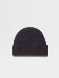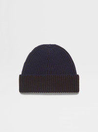 The ink blue and dark brown Oasi Cashmere beanie is both cozy and stylish. INFO Made from Zegna's luxuriously smooth cashmere yarn, the ink blue and dark brown Oasi Cashmere beanie is pleasantly soft and lightweight. This casual hat's pliable shape is the perfect way to complete casual looks. It is signed off with the Zegna 232 Road Brand Mark on the inside. PRODUCT CODE UEAT08A8-BNI-120 MATERIALS AND CARE 100% Cashmere The inspiration behind this Oasi Cashmere Collection garment was Born in Oasi Zegna, a 100km² natural territory and the home of our values. It's crafted from Oasi Cashmere fibres, which ZEGNA commits to certifying as traceable from 2024. The Oasi Cashmere Collection follows in the footsteps of our founder, who envisioned a vertically integrated system of producing textiles. Wash by hand. Do not bleach. Do not tumble dry. Flat drying. Iron at max 110°C. Professional dry cleaning in hydrocarbons, mild process. Wash and iron inside out. FIT AND PRODUCT DETAILS • Internal Zegna 232 Road Brand Mark • Made in Italy • Fits true to size