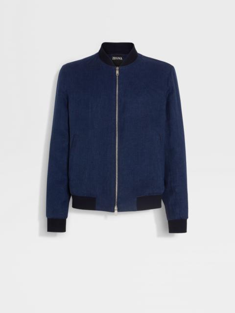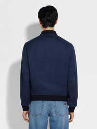 This navy blue bomber elevates a timeless sporty silhouette in Zegna's iconic Oasi Lino. INFO Crafted from our exclusive Oasi Lino, this navy blue pure linen bomber simultaneously embodies Zegna's vision of elevated leisurewear and sustainable luxury. Lined in silk-cotton, its timeless silhouette is edged with classic ribbed trims. PRODUCT CODE UFT54A9-F145-B99 MATERIALS AND CARE Main body: 100% Linen Leather details: Calf Leather Lining: 55% Mulberry Silk; 45% Cotton The inspiration behind this Oasi Lino garment was Born in Oasi Zegna, a 100km² natural territory and the home of our values. Crafted from European-grown flax fibres that are certified as 100% traceable from 2024, Oasi Lino follows in the footsteps of our founder, who envisioned a vertically integrated system of producing textiles. Do not wash. Do not bleach. Do not tumble dry. Iron at max 110° C. Professional dry cleaning in hydrocarbons, mild process. Professional leather clean only. Protect leather details before washing. Protect the metal accessories during washing. FIT AND PRODUCT DETAILS • Regular fit • Ribbed collar • Zip closure • Ribbed hem • Ribbed cuffs • Slanted welt pockets • Leather details • Silk and cotton lining • 65 cm length on size 48