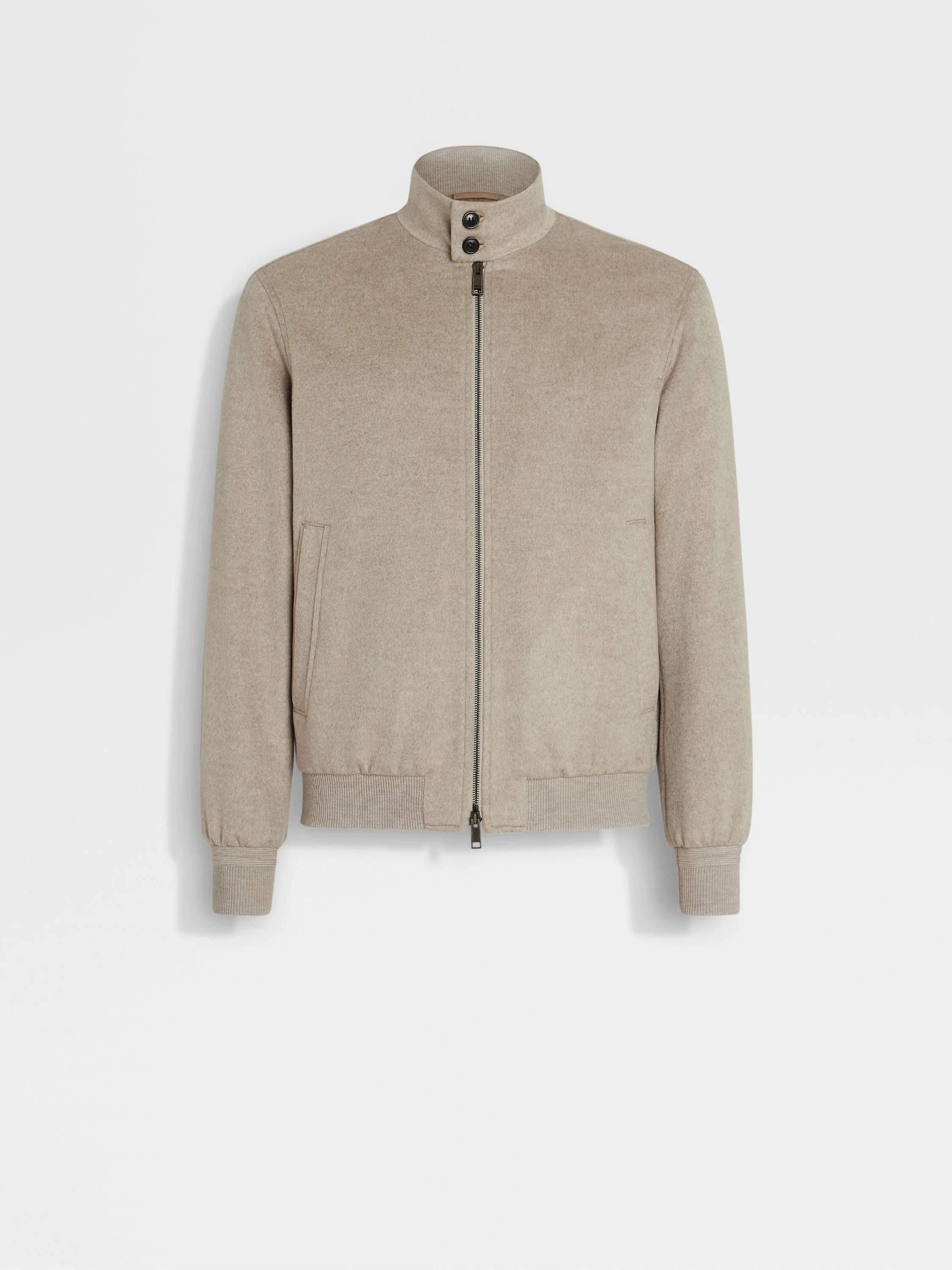 This light taupe multimelange Oasi Cashmere Elements blouson is the epitome of modern luxury. INFO ZEGNA's exclusive cashmere is given a water-repellent upgrade, making this light taupe multimelange Oasi Cashmere Elements blouson a reliable all-weather companion. Lined in luxurious wool-silk-cashmere fabric, its sporty silhouette is edged with classic ribbed trims. PRODUCT CODE UGT63A2-G153-N92 MATERIALS AND CARE Main body: 100% Cashmere Leather details: Calfskin Lining: 89% Wool; 6% Mulberry Silk; 5% Cashmere This Oasi Cashmere collection garment is crafted from soft cashmere that's made with 100% certified traceable fibres and specially treated with a water-repellent finish – a tribute to our Founder's legacy of textile innovation. Do not wash. Do not bleach. Do not tumble dry. Iron at max 110°C. Professional dry cleaning in hydrocarbons, mild process. Professional leather clean only. Protect leather details before washing. Protect the metal accessories during washing. FIT AND PRODUCT DETAILS • Regular fit • Stand collar • Zip and button closure • Ribbed hem and cuffs • Leather details • Inner ribbed collar • Slanted pockets • Wool, silk and cashmere lining • Water repellent • 64 cm length on size 48