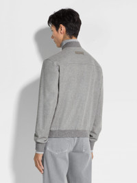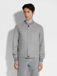 The grey mélange Oasi Cashmere Elements blouson enhances luxurious natural materials with a water-repellent membrane. INFO Zegna's exclusive, extra-fine cashmere is slightly felted to give the grey mélange Oasi Cashmere Elements blouson its beautifully textured finish. The jacket is equipped with a water-repellent membrane that preserves these qualities while adding even more protection. This sporty design is finished off with a ribbed bomber collar and ribbed cuffs to match. PRODUCT CODE UCT45A6-C119-428 MATERIALS AND CARE Main body: 100% Cashmere Leather details: Calfskin Lining: 100% Polyester This Oasi Cashmere Collection garment is crafted from soft cashmere that's specially treated with a water repellent finish — a tribute to our founder's legacy of textile innovation. We commit to certifying Oasi Cashmere fibres as 100% traceable from 2024. Do not wash. Do not bleach. Do not tumble dry. Iron at max 110°C. Professional dry cleaning in hydrocarbons, mild process. Professional leather clean only. Protect leather details before washing. FIT AND PRODUCT DETAILS • Regular fit • Ribbed bomber collar • Zip and button closure • Half-ribbed hem • Ribbed cuffs • Leather details • Side straight pockets with concealed snap buttons • Water repellent • Slightly felted fabric • 64 cm length on size 48 • Model is 188 cm tall (6.2 feet) and wears an Italian size 48.