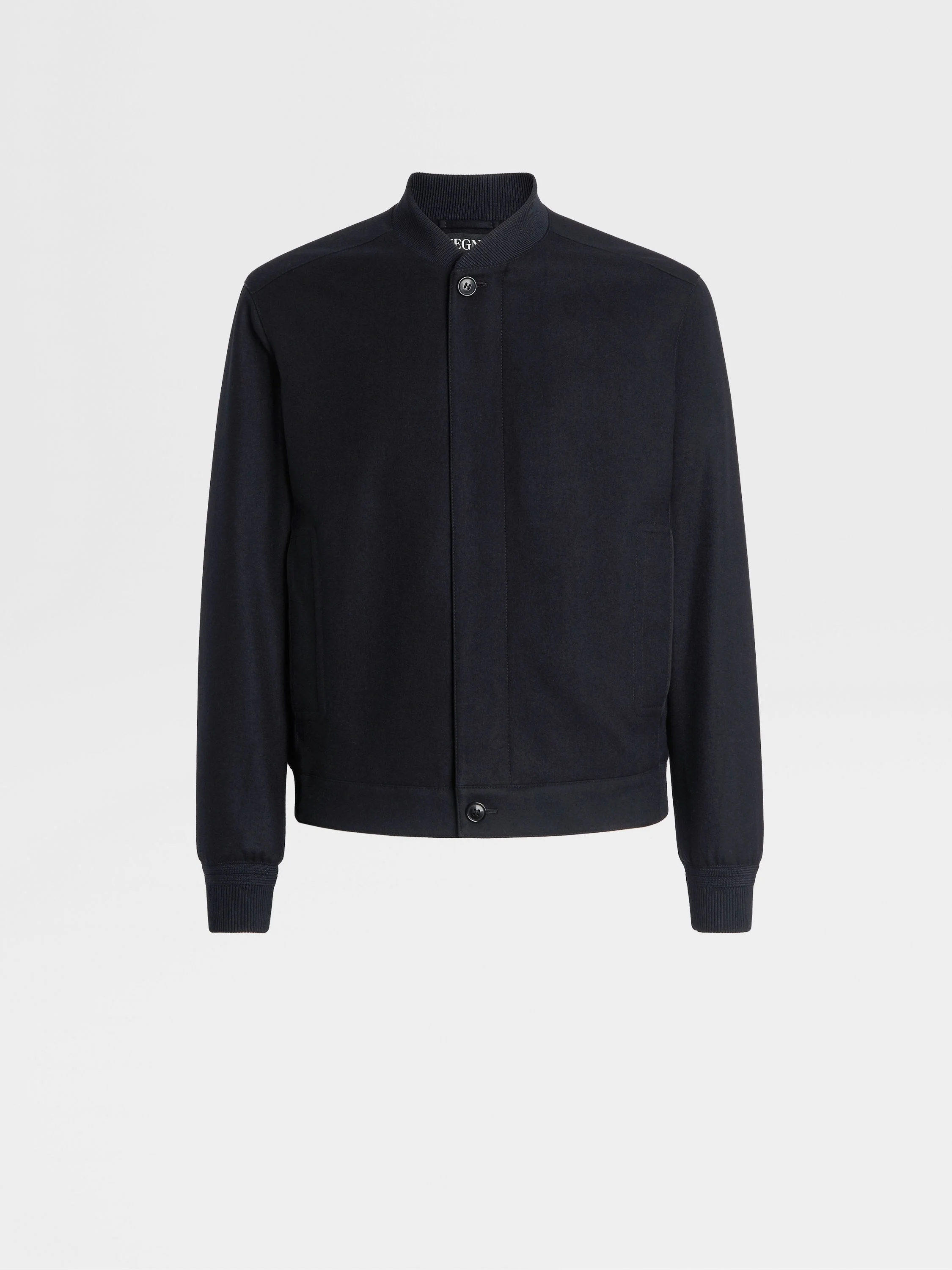 The navy blue Oasi Cashmere Elements bomber enhances luxurious natural materials with a water-repellent membrane. INFO Slightly felted for textured appeal, Zegna's exclusive, extra-fine cashmere gives the navy blue Oasi Cashmere Elements bomber its beautifully soft finish. The sporty bomber jacket features the classic, ribbed collars and trim. Leather details add a final touch of flair. PRODUCT CODE UCT46A6-C119-531 MATERIALS AND CARE Main body: 100% Cashmere Leather details: Calfskin Lining: 100% Polyester This Oasi Cashmere Collection garment is crafted from soft cashmere that's specially treated with a breathable water-resistant membrane — a tribute to our founder's legacy of textile innovation. Do not wash. Do not bleach. Do not tumble dry. Iron at max 110°C. Professional dry cleaning in hydrocarbons, mild process. Professional leather clean only. Protect leather details before washing. Protect the metal accessories during washing. FIT AND PRODUCT DETAILS • Regular fit • Ribbed bomber collar • Zip and button closure • Half-ribbed hem • Ribbed cuffs • Leather details • Slightly felted fabric • Side straight pockets with concealed snap buttons • Water repellent • 64 cm length on size 48 • Model is 190 cm tall (6.2 feet) and wears an Italian size 48.
