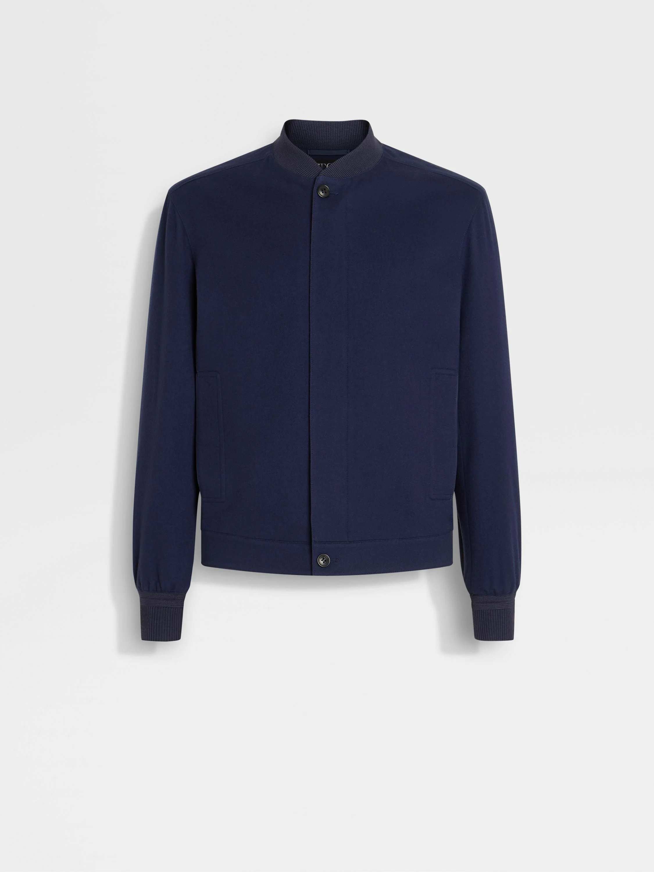 Urban style with weatherproof reliability: the ink blue bomber is made of Oasi Cashmere Elements fabric with a subtly felted finish. INFO ZEGNA's exclusive cashmere fabric is elevated with innovative technology for a fully water-repellent finish, making this ink blue Oasi Cashmere Elements bomber an elegant all-weather essential. Ribbed trims and snap button pockets cement the timeless allure of its streetwise silhouette, while leather details add a sleek touch. PRODUCT CODE UGT46A2-C119-B06 MATERIALS AND CARE Main body: 100% Cashmere Leather details: Calfskin Lining: 100% Polyester This Oasi Cashmere collection garment is crafted from soft cashmere that's made with 100% certified traceable fibres and specially treated with a water-repellent finish – a tribute to our Founder's legacy of textile innovation. Do not wash. Do not bleach. Do not tumble dry. Iron at max 110° C. Professional dry cleaning in hydrocarbons, mild process. Professional leather clean only. Protect leather details before washing. Protect the metal accessories during washing. FIT AND PRODUCT DETAILS • Regular fit • Ribbed bomber collar • Zip and button closure • Half-ribbed hem • Ribbed cuffs • Leather details • Side straight pockets with concealed snap buttons • Water repellent • Slightly felted fabric • 64 cm length on size 48