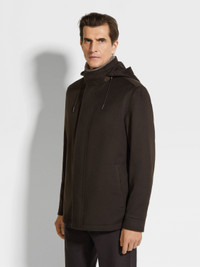 The dark brown Oasi Cashmere Elements Cima overjacket is the epitome of luxury outerwear. INFO Zegna's exclusive cashmere is made water-repellent using innovative technology, granting the dark brown Oasi Cashmere Elements Cima overjacket its exceptional weather resistance. The ultra-smooth finish of this luxury fabric elevates any adventure. A hooded stand collar, welt pockets, and leather accents complete the sleek design. CIMA ('tʃima) — ITALIAN FOR 'SUMMIT' The inspiration for the Cima Jacket was Born in Oasi Zegna — the home of our values in the Italian Alps. It's crafted from Oasi Cashmere fibres, which ZEGNA commits to certifying as traceable from 2024. The pinnacle of our outdoor-ready offering, it's worn for warmth during revitalising hikes. PRODUCT CODE UET42A8-7210-M09 MATERIALS AND CARE Main body: 100% Cashmere Leather details: Calfskin Lining: 100% Polyester This Oasi Cashmere Collection garment is crafted from soft cashmere that's specially treated with a water repellent finish — a tribute to our founder's legacy of textile innovation. We commit to certifying Oasi Cashmere fibres as 100% traceable from 2024. Do not wash. Do not bleach. Do not tumble dry. Iron at max 110°C. Professional dry cleaning in hydrocarbons, mild process. Professional leather clean only. Protect leather details before washing. FIT AND PRODUCT DETAILS • Regular fit • Stand collar with hood • Open hem • Adjustable cuffs • Zip and button closure • Welt pockets • Leather details and drawstring • Water repellent • 74 cm length on size 48