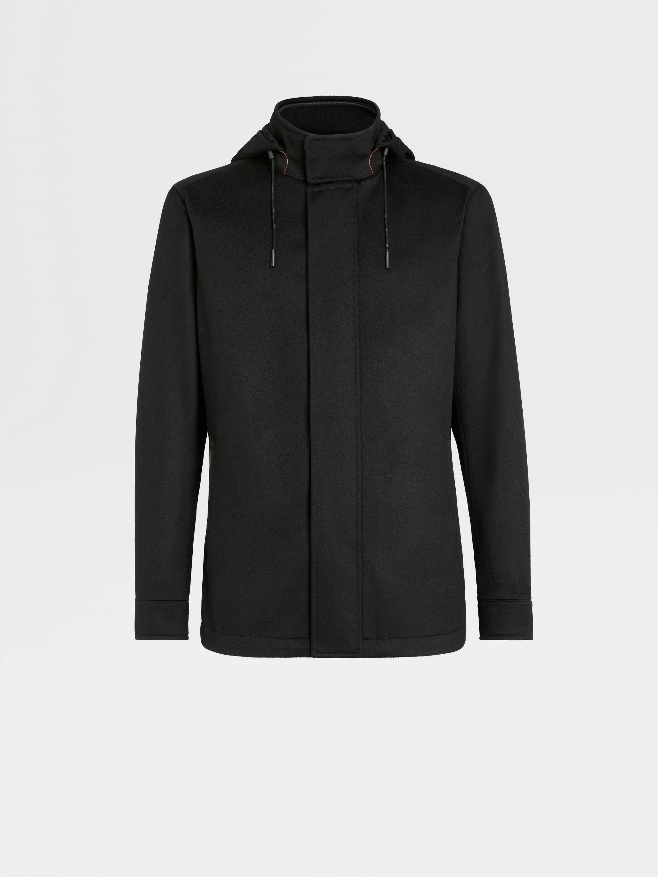 The Oasi Cashmere Elements Cima overjacket is an epitome of luxury outerwear. INFO Zegna's exclusive cashmere is made water-repellent using innovative technology, granting the black Oasi Cashmere Elements hooded Cima overjacket its exceptional weather resistance. The ultra-smooth finish of this luxury fabric elevates any adventure. Leather accents and meticulously crafted details complete the sleek design. The inspiration for the Cima Jacket, Cima the Italian word for 'Summit', was Born in Oasi Zegna — the home of our values in the Italian Alps. It's crafted from Oasi Cashmere fibers, which ZEGNA commits to certifying as traceable from 2024. The pinnacle of our outdoor-ready offering, wear it for warmth during revitalising hikes. Customize this item with our Made to Measure Service. For more information, please contact our Customer Care or visit your nearest stores. PRODUCT CODE E7T42-7210-001 MATERIALS AND CARE Main body: 100% Cashmere Leather details: Calfskin Lining: 100% Polyester This Oasi Cashmere Collection garment is crafted from soft cashmere that's specially treated with a breathable water-resistant membrane — a tribute to our founder's legacy of textile innovation. Do not wash. Do not bleach. Do not tumble dry. Iron at max 110°C. Professional dry cleaning in hydrocarbons, mild process. Professional leather clean only. Protect leather details before washing. Protect the metal accessories during washing. FIT AND PRODUCT DETAILS • Regular fit • Stand collar • Open hem • Zip and button closure • Welt pockets • Leather details and drawstring • Water repellent • 74 cm length on size 48 • Model is 190 cm tall (6.2 feet) and wears an Italian size 48.