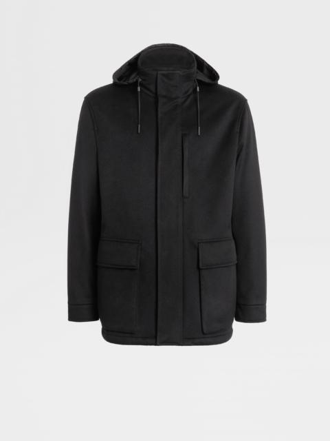 The Oasi Cashmere Elements Vetta overjacket is an epitome of luxury outerwear. INFO Zegna's exclusive cashmere is made water-repellent using innovative technology, granting the navy blue Oasi Cashmere Elements padded Vetta overjacket its exceptional weather resistance. Equipped with a foldable hood, the ultra-smooth finish of this luxury fabric elevates any adventure. Leather accents and meticulously crafted details complete the sleek design. The inspiration for the Vetta Jacket, Vetta the Italian word for 'Peak', was Born in Oasi Zegna — the home of our values in the Italian Alps. It's crafted from Oasi Cashmere fibers, which ZEGNA commits to certifying as traceable from 2024. It's ideal weathering the elements wherever your next adventure takes you - from mountain peaks to city streets. Customize this item with our Made to Measure Service. For more information, please contact our Customer Care or visit your nearest stores. PRODUCT CODE E7T44-7351-532 MATERIALS AND CARE Main body: 100% Cashmere Leather details: Calfskin Lining: 50% Cotton; 30% Cashmere; 20% Mulberry Silk Padding: 100% Polyester This Oasi Cashmere Collection garment is crafted from soft cashmere that's specially treated with a breathable water-resistant membrane — a tribute to our founder's legacy of textile innovation. Do not wash. Do not bleach. Do not tumble dry. Iron at max 110°C. Professional dry cleaning in hydrocarbons, mild process. Professional leather clean only. Protect leather details before washing. Protect the metal accessories during washing. FIT AND PRODUCT DETAILS • Regular fit • Stand collar with stowaway hood • Zip and snap button closure • Adjustable hem and cuffs • Leather details • Patch and straight pockets • Polyester padding • 78 cm length on size 48 • Model is 188 cm tall (6.2 feet) and wears an Italian size 48.