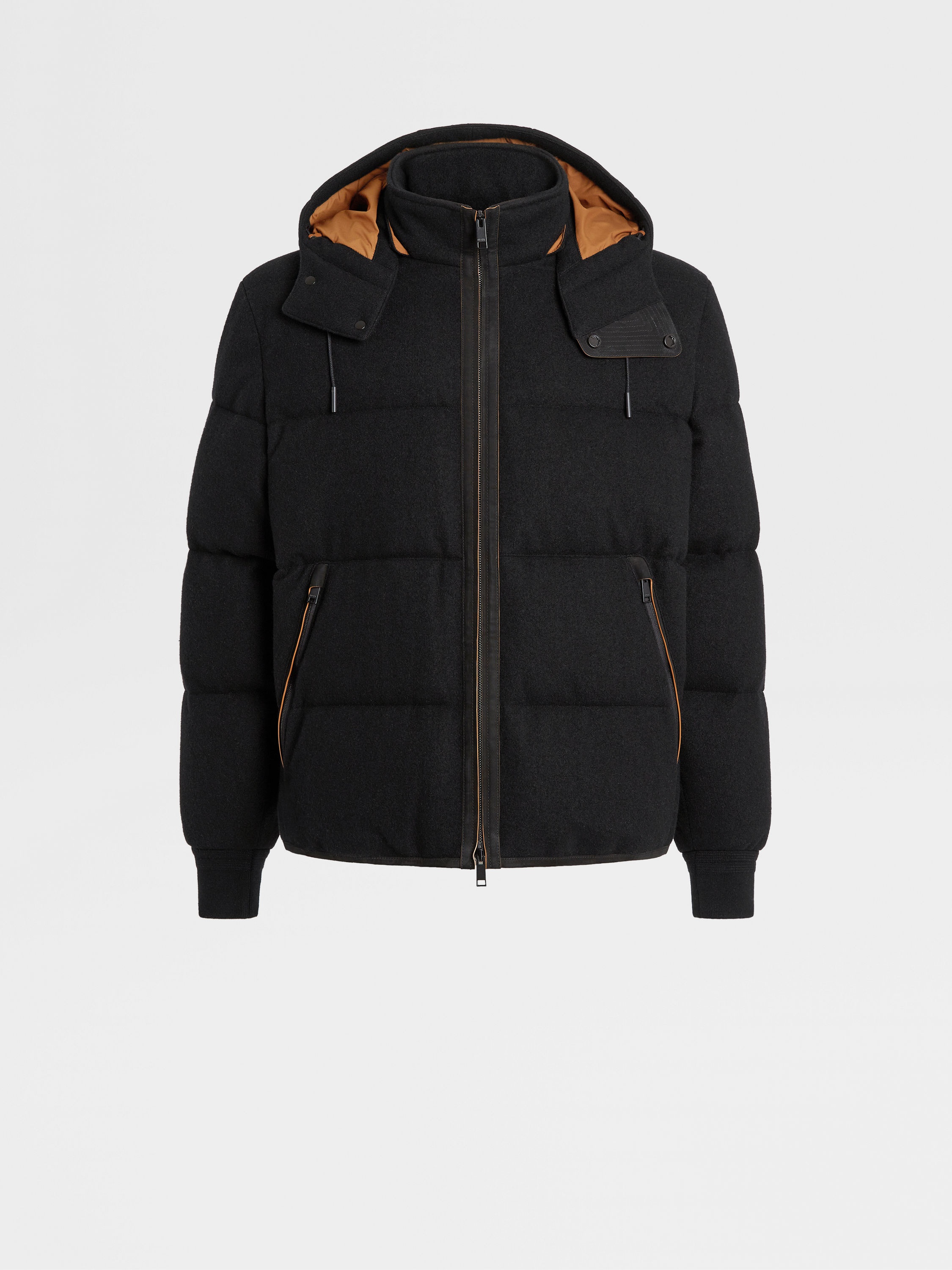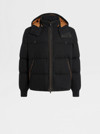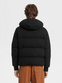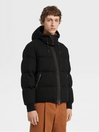 The black Oasi Cashmere down-padded Ghiaccio blouson pairs a luxurious exterior with warm padding. INFO Showcasing one of Zegna's finest knits, the black Oasi Cashmere down-padded Ghiaccio blouson is elevated by its plush texture. Perfect for outdoor adventures as well as active days in the city, the Ghiaccio blouson is water-repellent and features a detachable hood for added versatility. A stand collar and leather details complete the sleek look. The inspiration for the Ghiaccio Puffer, Ghiaccio the Italian word for 'Ice', was Born in Oasi Zegna, the home of our values in the Italian Alps. It's crafted from Oasi Cashmere fibres, which ZEGNA commits to certifying as traceable from 2024. Soft, sporty and sophisticated, wear it for warmth in cool climes. PRODUCT CODE UAT48-A102-001 MATERIALS AND CARE Main body: 100% Cashmere Leather details: Calfskin Lining: 100% Polyester Padding: 90% Goose down; 10% Feather This Oasi Cashmere Collection garment was Born in Oasi Zegna, our 100km² natural territory and the home of our values. Crafted from cashmere of uncompromising quality and softness, the Oasi Cashmere Collection follows in the footsteps of our founder, who envisioned a vertically integrated system of producing textiles. Do not wash. Do not bleach. Do not tumble dry. Iron at max 110°C. Professional dry cleaning in hydrocarbons, mild process. Professional leather clean only. Protect leather details before washing. Protect the metal accessories during washing. FIT AND PRODUCT DETAILS • Regular fit • Stand collar • Zip closure • Open hem • Knit cuffs • Detachable hood • Leather details • Slanted pockets • Goose down and polyester padding • Water repellent • 68 cm length on size 48 • Model is 186 cm tall (6.1 feet) and wears an Italian size 48.