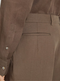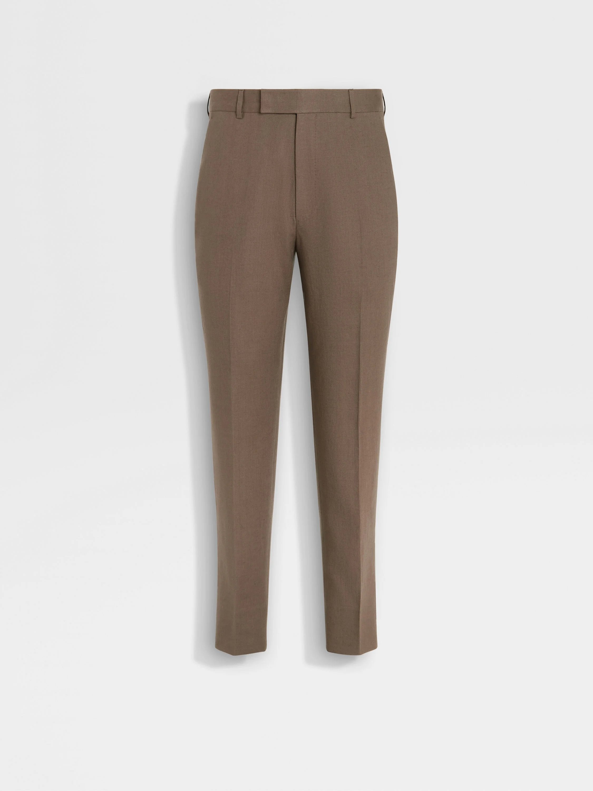 These dark taupe Oasi Lino pants are made from Zegna's 100% traceable, European-grown linen. INFO These dark taupe pants exude authentic charm through the natural texture of their pure linen weave, crafted from Zegna's fully traceable Oasi Lino fabric. Styled with a sleek flat-fronted silhouette and a slim leg for impeccable yet understated elegance for formal occasions. PRODUCT CODE 973F11A9-77TB12 MATERIALS AND CARE 100% Linen The inspiration behind this Oasi Lino garment was Born in Oasi Zegna, a 100km² natural territory and the home of our values. Crafted from European-grown flax fibres that are certified as 100% traceable from 2024, Oasi Lino follows in the footsteps of our founder, who envisioned a vertically integrated system of producing textiles. Do not wash. Do not bleach. Do not tumble dry. Professional dry cleaning in tetrachloroethene and hydrocarbons, mild process. FIT AND PRODUCT DETAILS • Slim fit • Tailoring pants • 18.5 cm hem • Zip and button closure • Slanted pockets • Flat front style