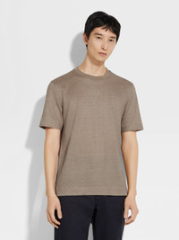 This light taupe Oasi Lino T-shirt is made from Zegna's 100% traceable, European-grown linen. INFO The sophisticated texture of pure linen elevates an everyday basic to perfection with this light taupe T-shirt, crafted from Zegna's Oasi Lino fabric. Folded trims enrich its timeless crew-neck silhouette for a sleek, streamlined finish. PRODUCT CODE UF352A9-F776-N02 MATERIALS AND CARE 100% Linen The inspiration behind this Oasi Lino garment was Born in Oasi Zegna, a 100km² natural territory and the home of our values. Crafted from European-grown flax fibres that are certified as 100% traceable from 2024, Oasi Lino follows in the footsteps of our founder, who envisioned a vertically integrated system of producing textiles. Do not wash. Do not bleach. Do not tumble dry. Iron at max 110° C. Professional dry cleaning in hydrocarbons, mild process. FIT AND PRODUCT DETAILS • Short sleeves • Crewneck collar • Folded hem and cuffs • Regular fit