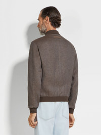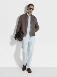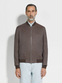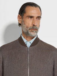 This dark taupe bomber elevates a timeless sporty silhouette in Zegna's iconic Oasi Lino. INFO Crafted from our exclusive Oasi Lino, this dark taupe pure linen bomber simultaneously embodies Zegna's vision of elevated leisurewear and sustainable luxury. Lined in silk-cotton, its timeless silhouette is edged with classic ribbed trims. PRODUCT CODE UFT54A9-F145-N07 MATERIALS AND CARE Main body: 100% Linen Leather details: Calf Leather Lining: 55% Mulberry Silk; 45% Cotton The inspiration behind this Oasi Lino garment was Born in Oasi Zegna, a 100km² natural territory and the home of our values. Crafted from European-grown flax fibres that are certified as 100% traceable from 2024, Oasi Lino follows in the footsteps of our founder, who envisioned a vertically integrated system of producing textiles. Do not wash. Do not bleach. Do not tumble dry. Iron at max 110° C. Professional dry cleaning in hydrocarbons, mild process. Professional leather clean only. Protect leather details before washing. Protect the metal accessories during washing. FIT AND PRODUCT DETAILS • Regular fit • Ribbed collar • Zip closure • Ribbed hem • Ribbed cuffs • Slanted welt pockets • Leather details • Silk and cotton lining • 65 cm length on size 48