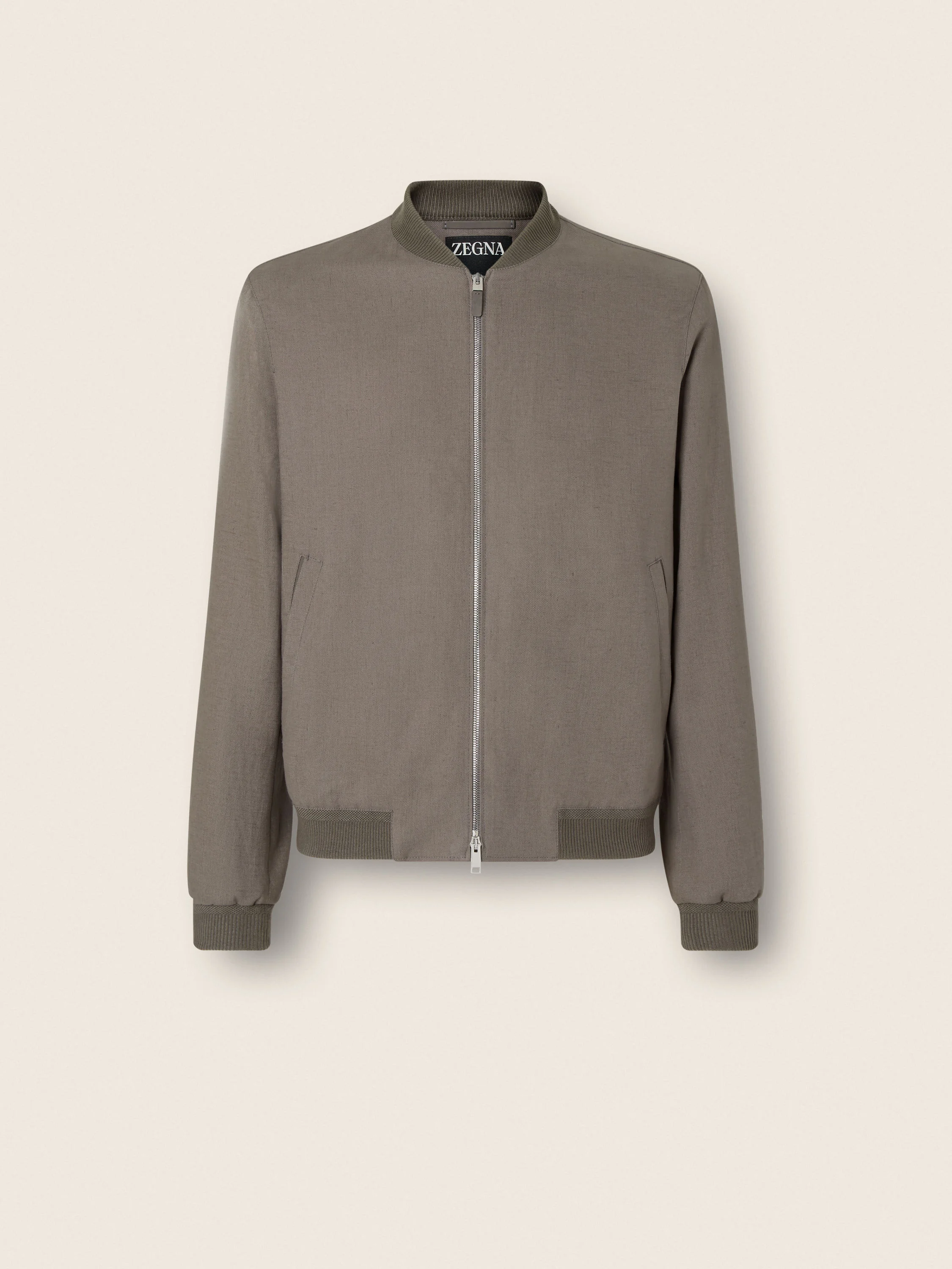 This dark taupe Oasi Lino bomber elevates an off-duty icon to luxury status. INFO Pure linen fibers give this Oasi Lino bomber jacket an authentic charm and elevated feel. Presented in a rich dark taupe colorway, it features classic ribbed trims and a zip-through closure. Leather details and a silk-cotton lining add a refined finish. PRODUCT CODE UHT52A3-H145-N07 MATERIALS AND CARE Main body: 100% Linen Lining: 58% Cotton; 42% Mulberry Silk Leather details: Calfskin The inspiration behind this Oasi Lino garment was born in Oasi Zegna, a 100km² natural territory and the home of our values. Crafted from European-grown flax fibres that are 100% certified traceable, Oasi Lino follows in the footsteps of our Founder, who envisioned a vertically integrated system of producing textiles. Do not wash. Do not bleach. Do not tumble dry. Iron at max 110°C. Professional dry cleaning in hydrocarbons, mild process. Professional leather clean only. Protect leather details before washing. Protect the metal accessories during washing. FIT AND PRODUCT DETAILS • Regular fit • Ribbed collar • Zip closure • Ribbed hem and cuffs • Leather details • Slanted welt pockets • Cotton and silk lining • 65 cm length on size 48